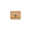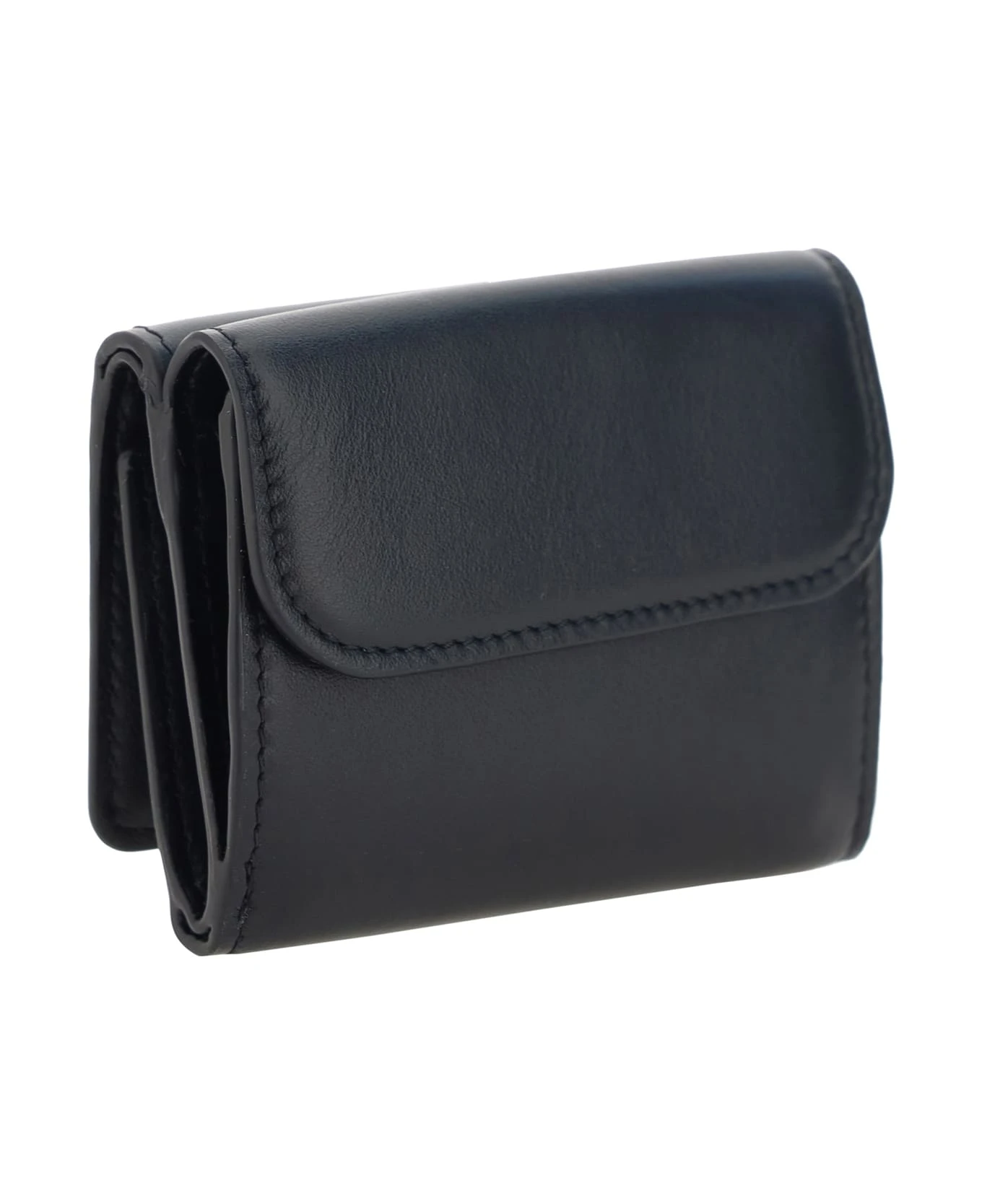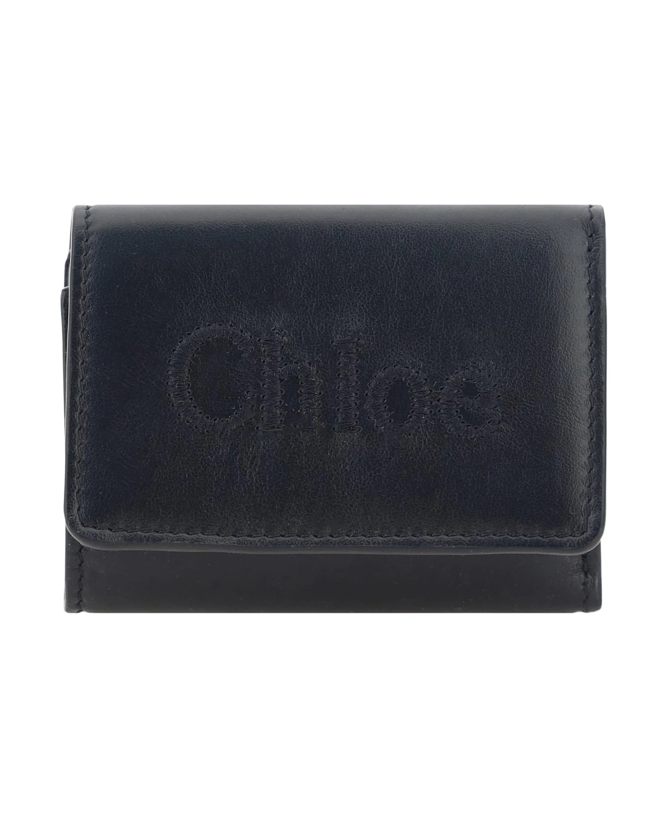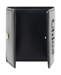 Calfskin trifold mini wallet by chloé, iconic brand logo embroidered in relief on the front, front closure with snap button, coin compartment on the back, smooth leather design, inside banknote compartment.