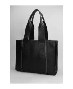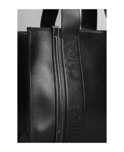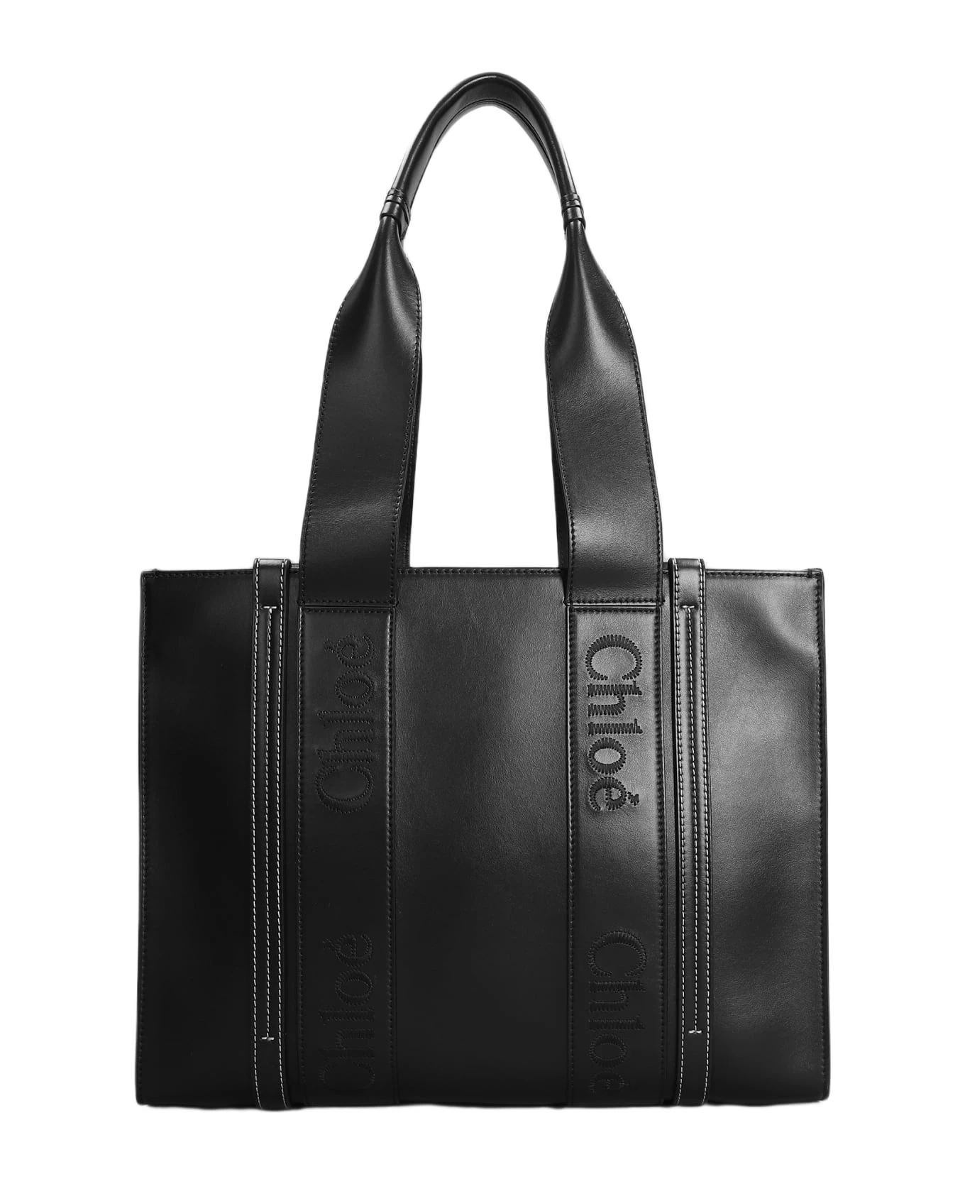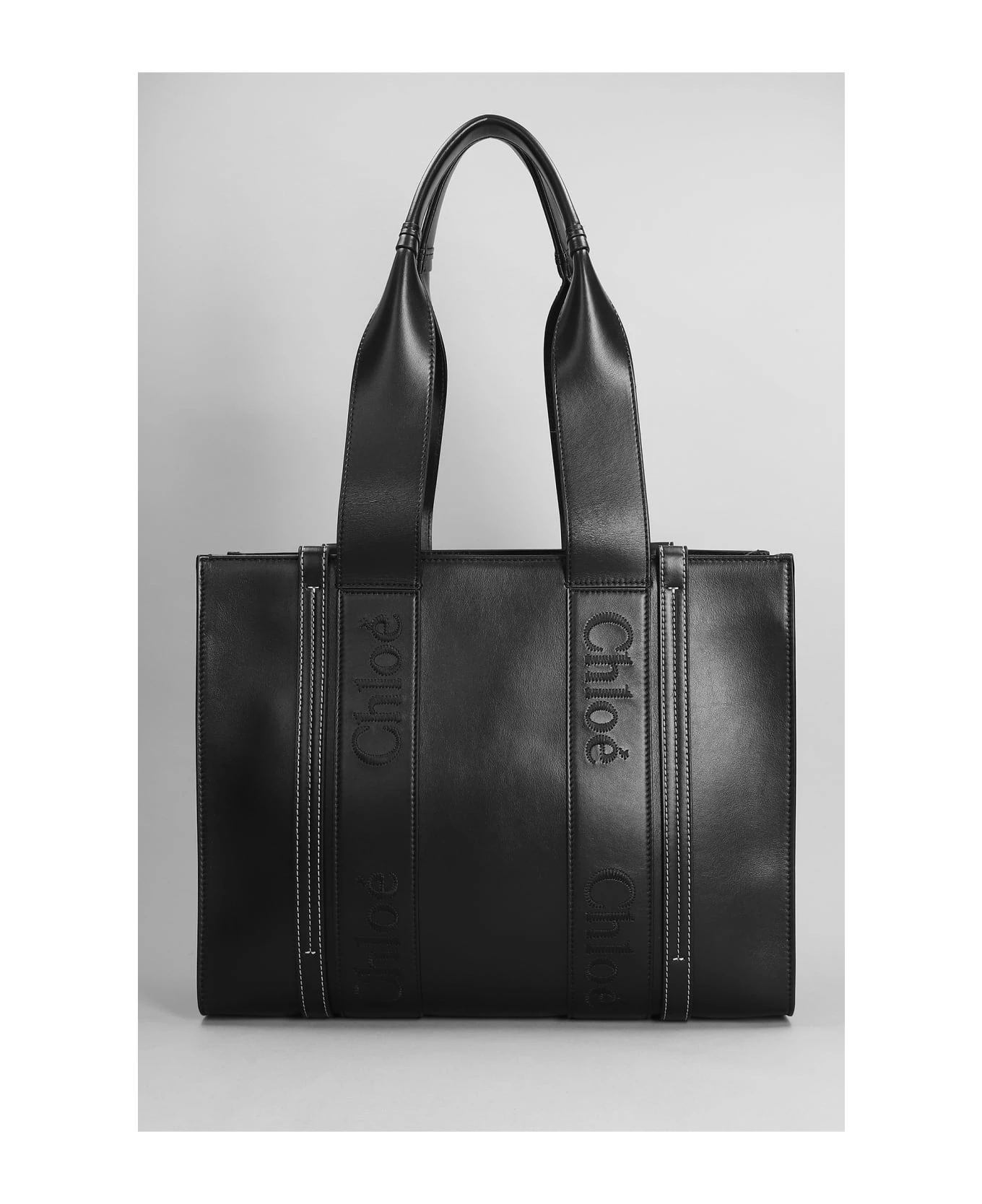 Woody Tote in black leather, double handle, engraved logo, 100% leather, Made in Italy, Height 285 mm, Width 365 mm