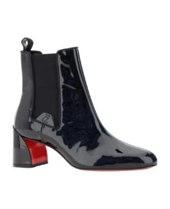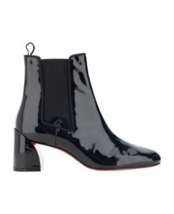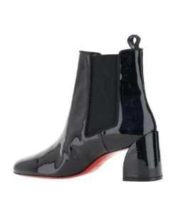 Calfskin turelastic ankle boot by christian louboutin, an elongated toe, elastic bands on side panels, slip-on style, pull on back for easy fit, patent leather effect design, chunky geometric heel.