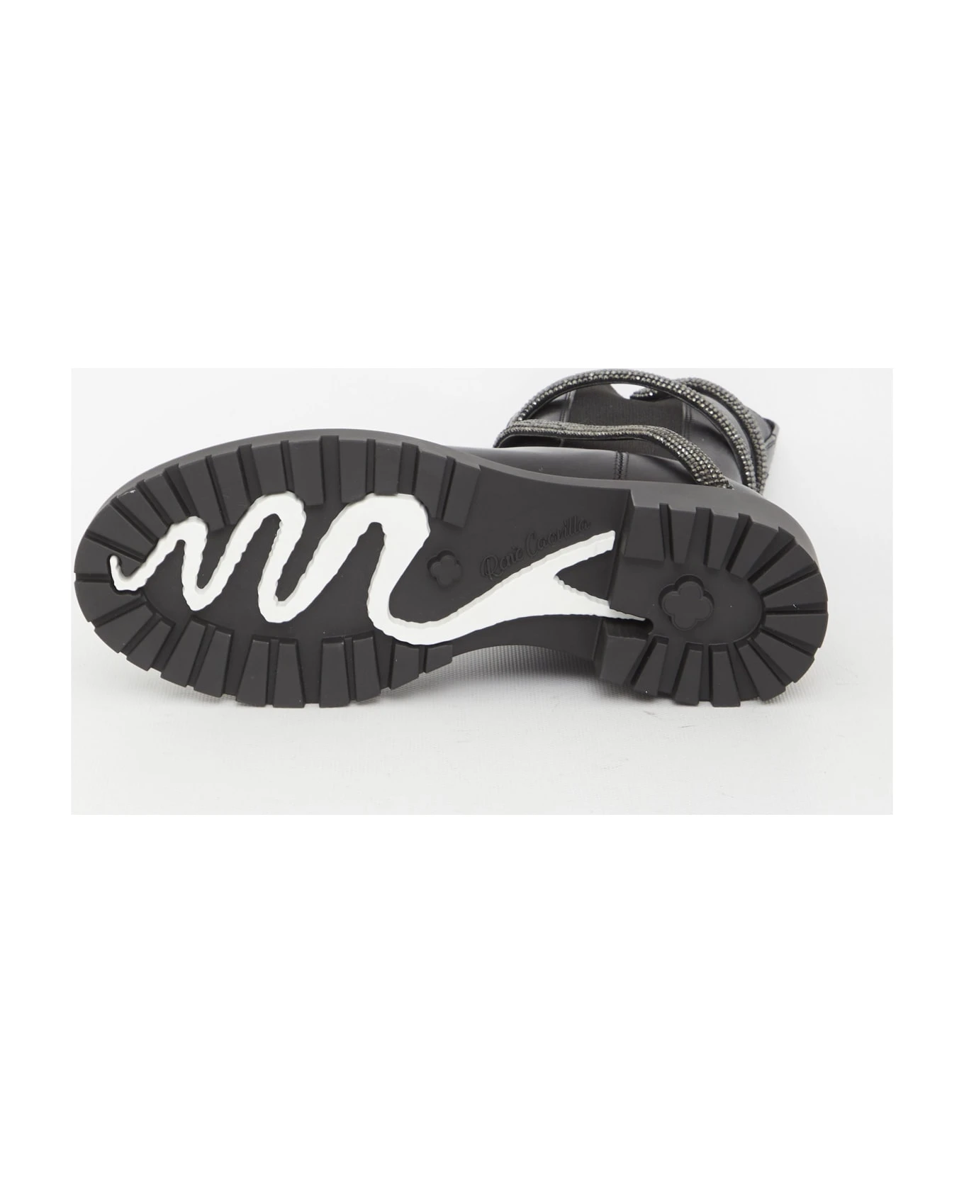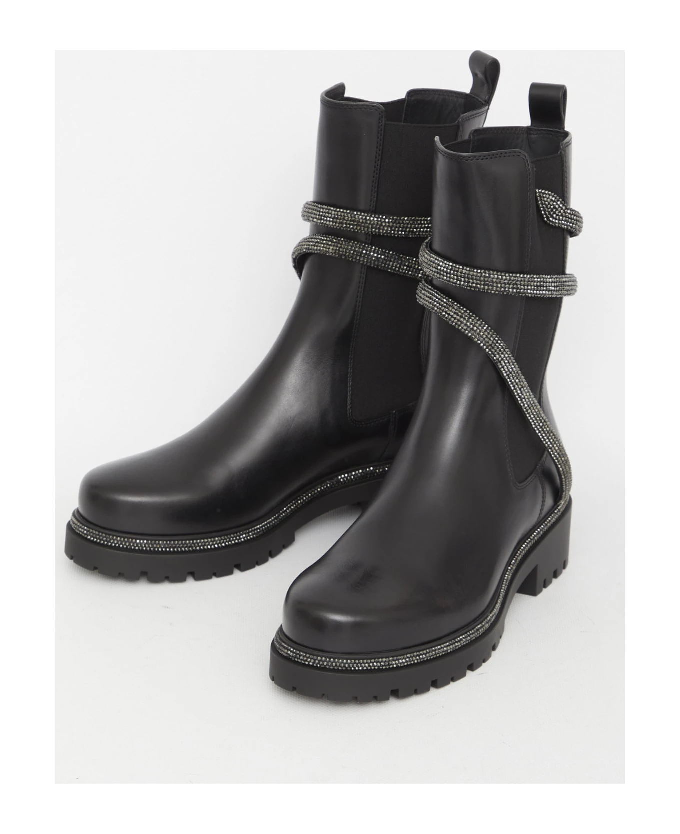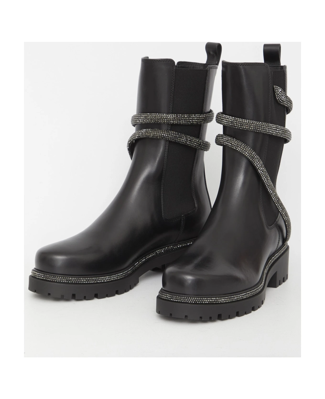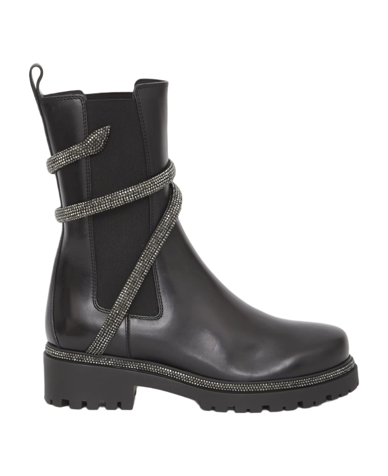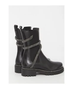 Cleo Biker boots in black calfskin with rhinestone Snake. They feature side stretch inserts and rubber sole.