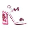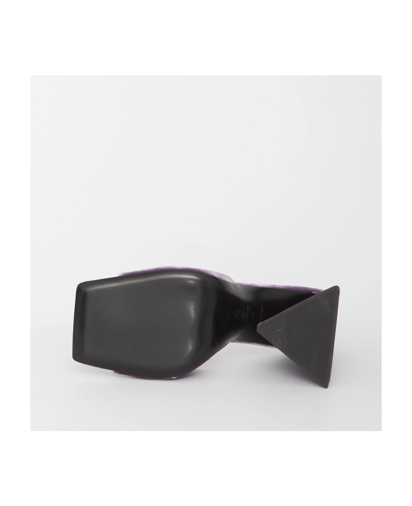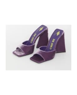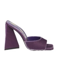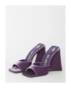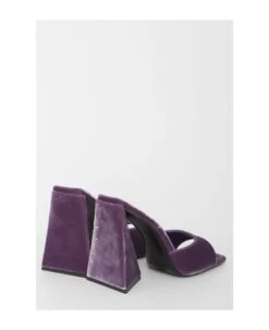 Devon mules in purple velvet with square and open toe and geometric heel. Leather sole.