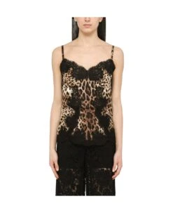 Top by Dolce & Gabbana in stretch silk animalier pattern, featuring thin straps and lace inserts.