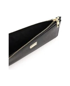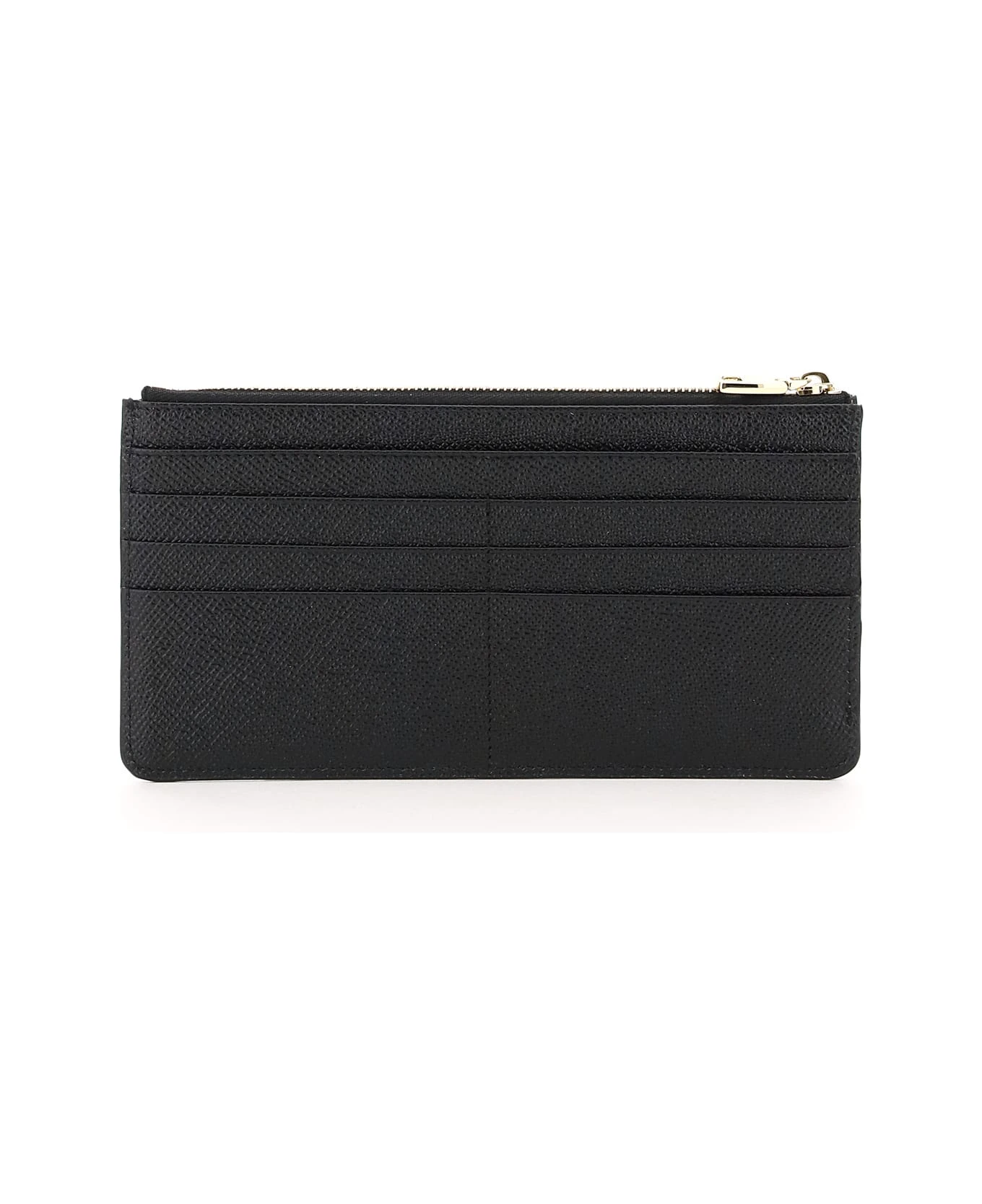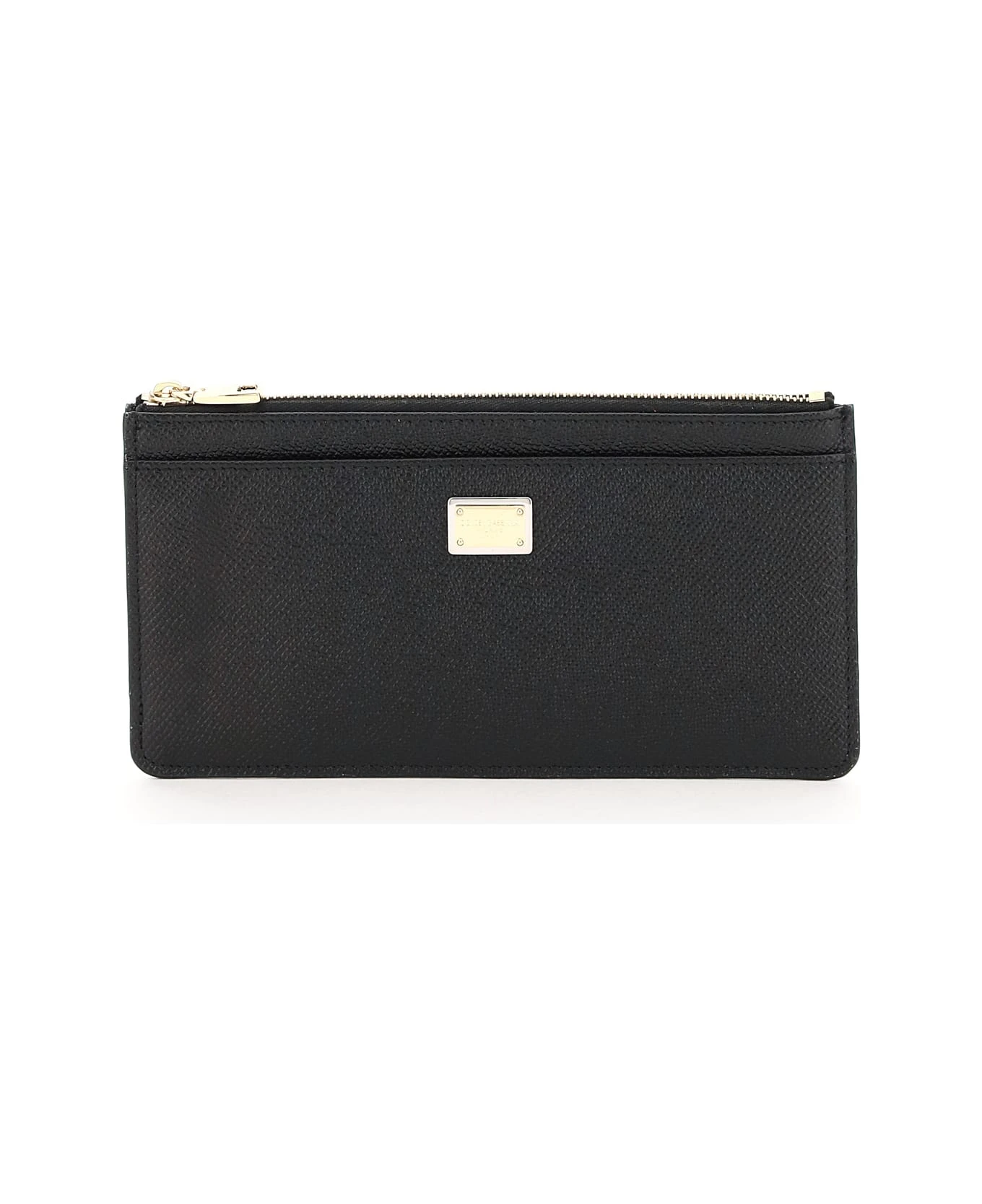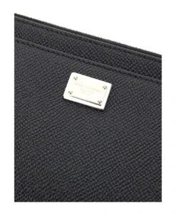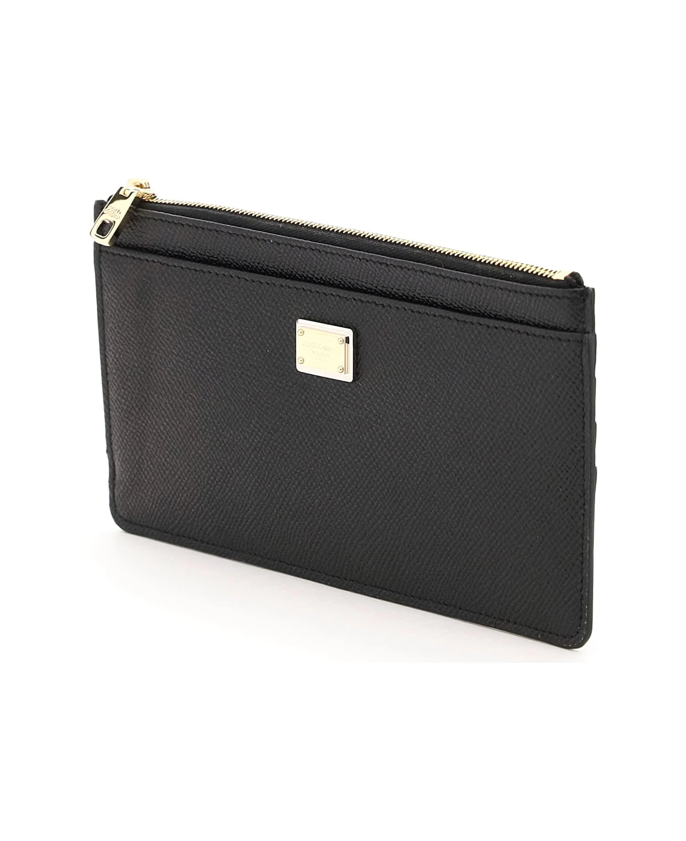 Dolce & Gabbana pouch in Dauphine calfskin, featuring front slit pocket with the iconic bigalvanic logo plaque. One flat pocket and six credit card slots on the back, central compartment with zip and side gusset, fabric lining, gold-finish metal hardware.