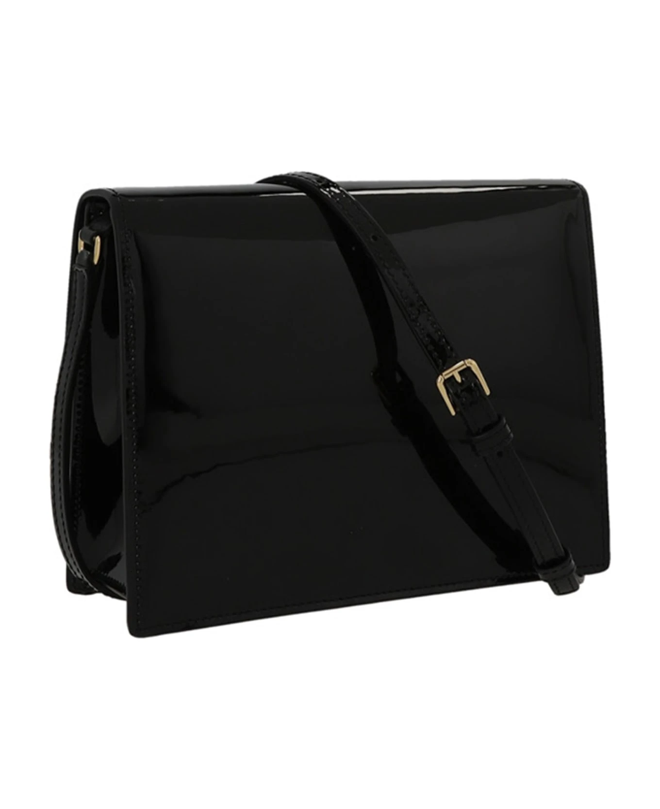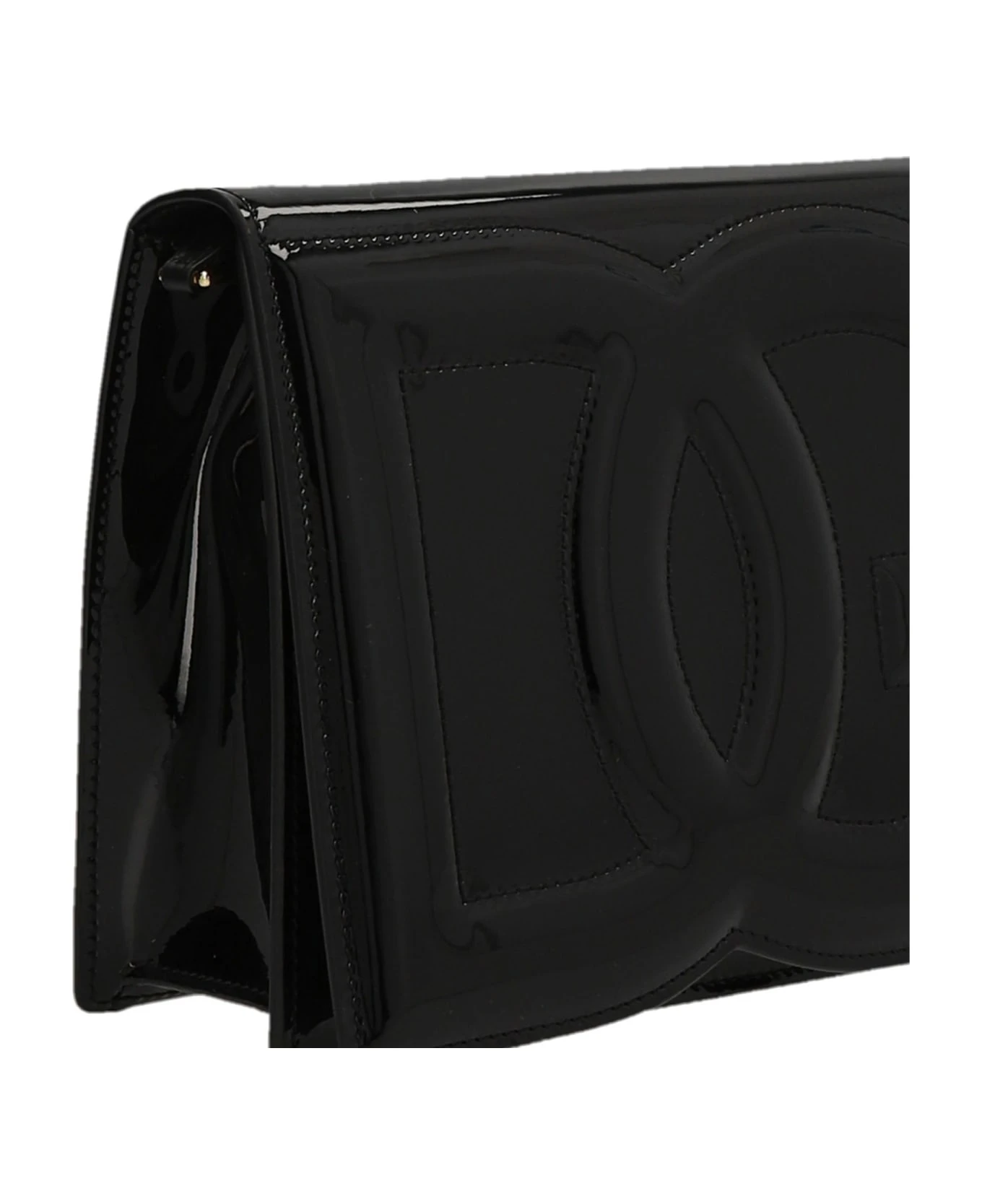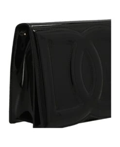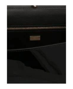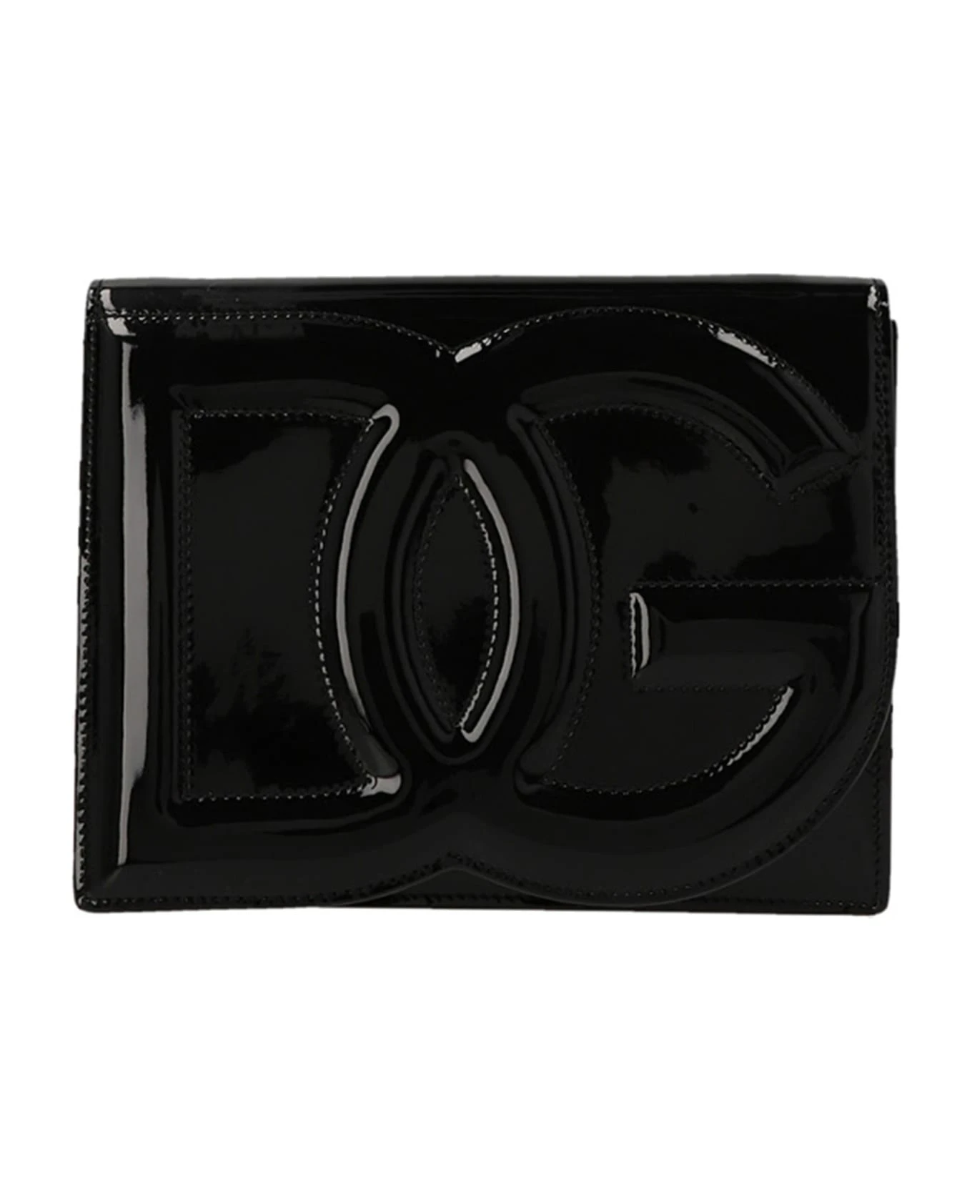Patent leather shoulder strap with three-dimensional quilted DG logo, flap closure with hidden magnet, calf leather lining, zip pocket, snap button strap compartment, and adjustable and removable shoulder strap.