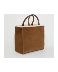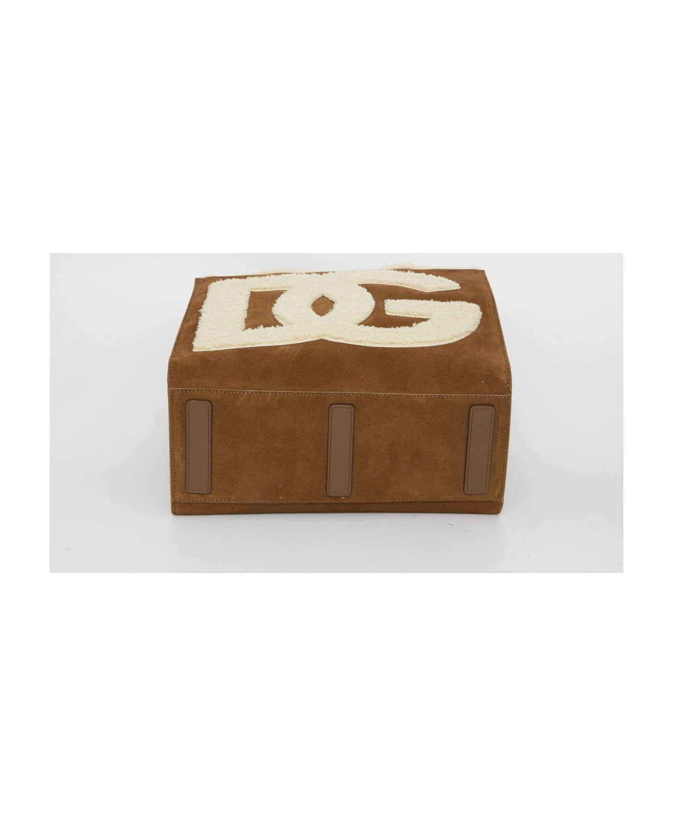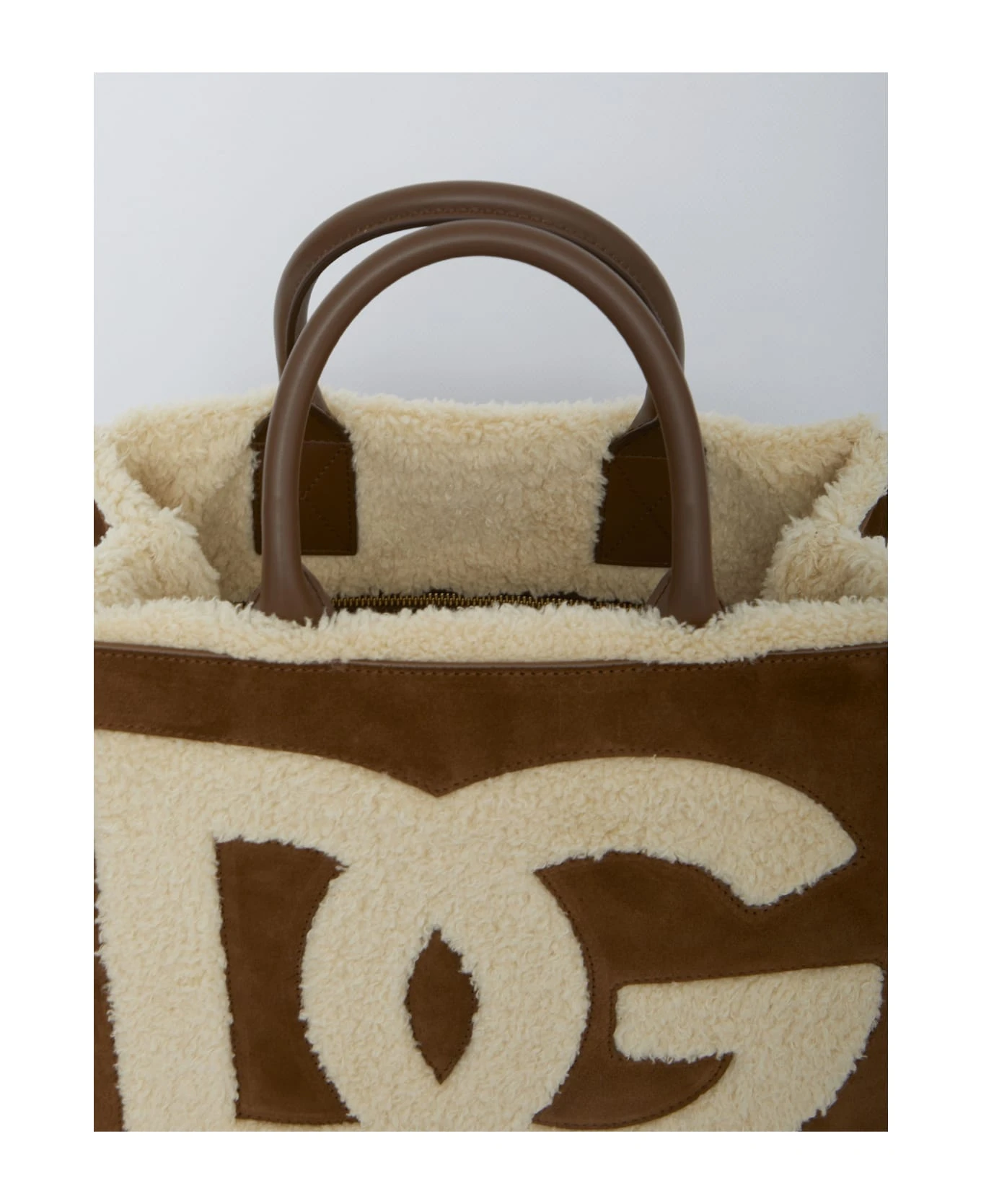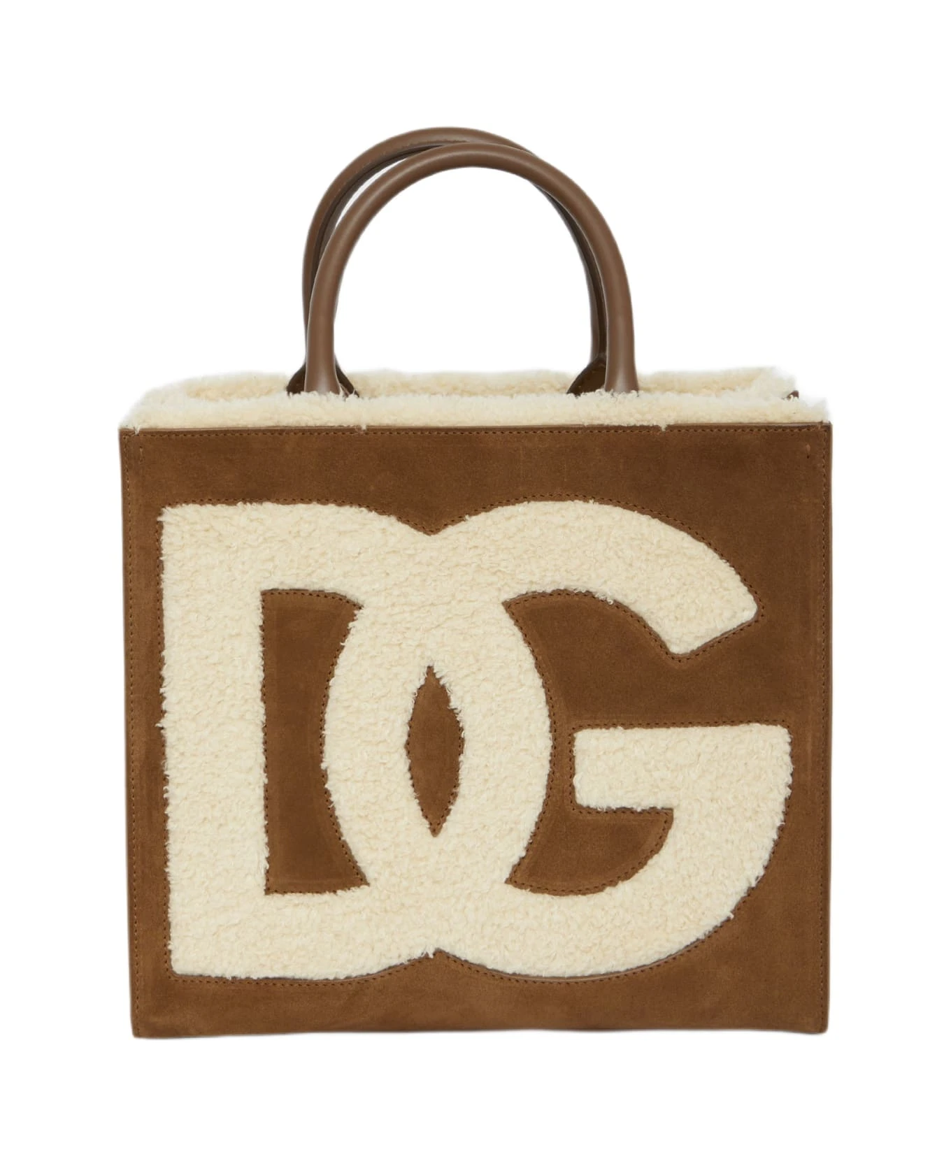 DG Daily tote bag in brown suede with DG logo and lining in shearling fabric. It features fixed double handles, one main interior compartment, one interior zip pocket, one interior slip pocket and one interior card slot.
