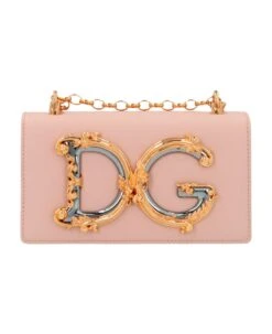 ‘DG Girl’ mini calf leather crossbody bag with gold logo and hardware, flap closure and chain shoulder strap.