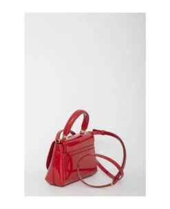 Mini bag in red shiny calfskin with embossed tonal DG logo on the front. It features fixed top handle, adjustable shoulder strap, magnetic closure, one main interior compartment and one interior zip pocket. One flat rear pocket.
