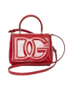 Mini bag in red shiny calfskin with embossed tonal DG logo on the front. It features fixed top handle, adjustable shoulder strap, magnetic closure, one main interior compartment and one interior zip pocket. One flat rear pocket.