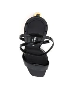 Dolce & Gabbana sandals of the DG Pop Collection in patent leather with the DG crossover logo as heel in gold-plated carbon. Ankle adjustable strap crisscrossed on the back with gold-finished metal buckle, leather insole, leather sole.
