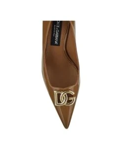 Dolce & Gabbana pumps in caramel patent leather with pointed toe, golden-finish metal DG logo plaque with cut-out details on the upper and stiletto low heel covered with caramel patent leather.
