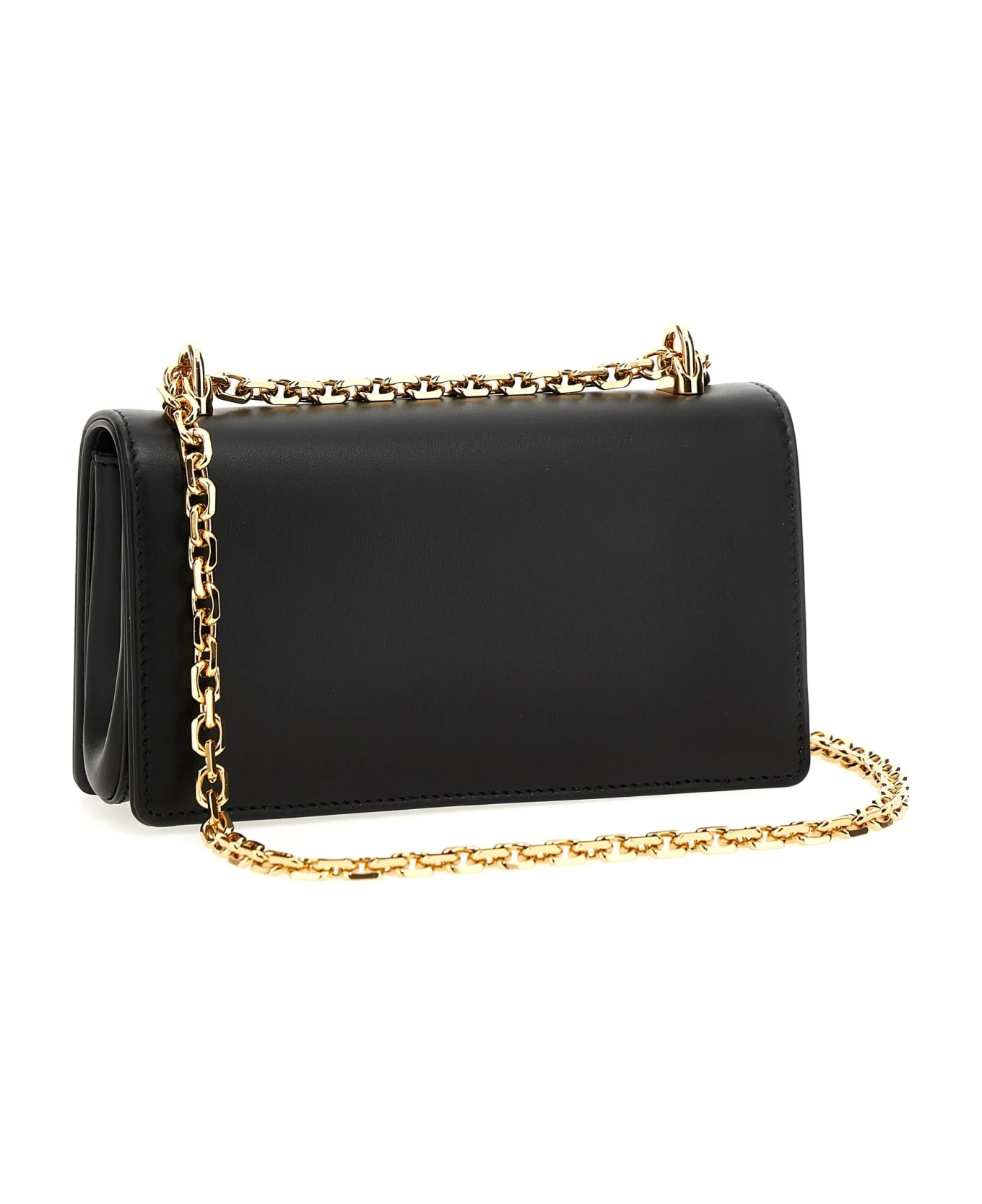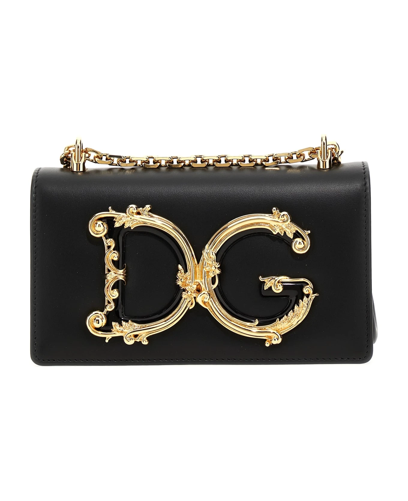 DG leather smartphone holder with magnetic closure, front metal logo appliqué and chain handle.