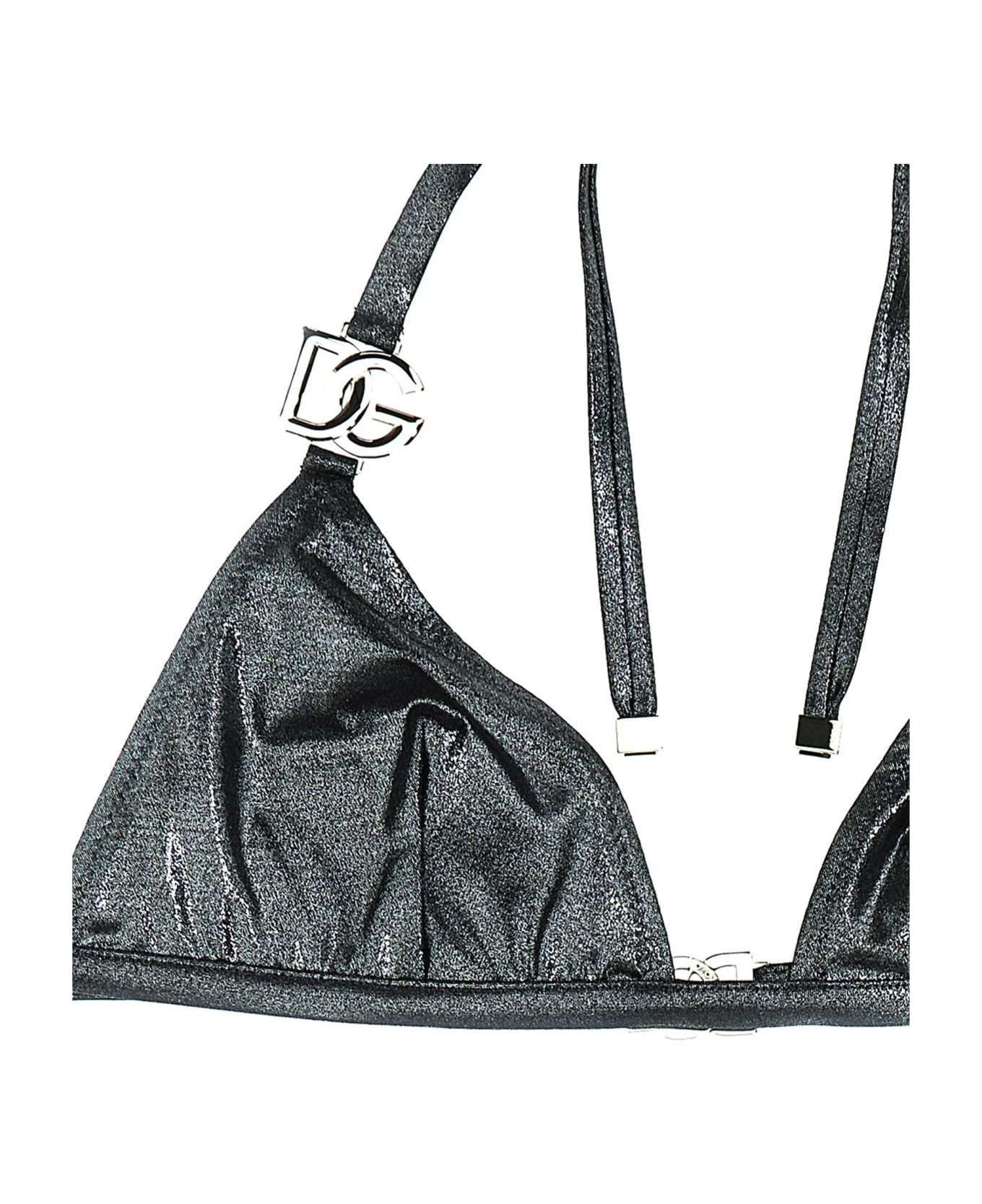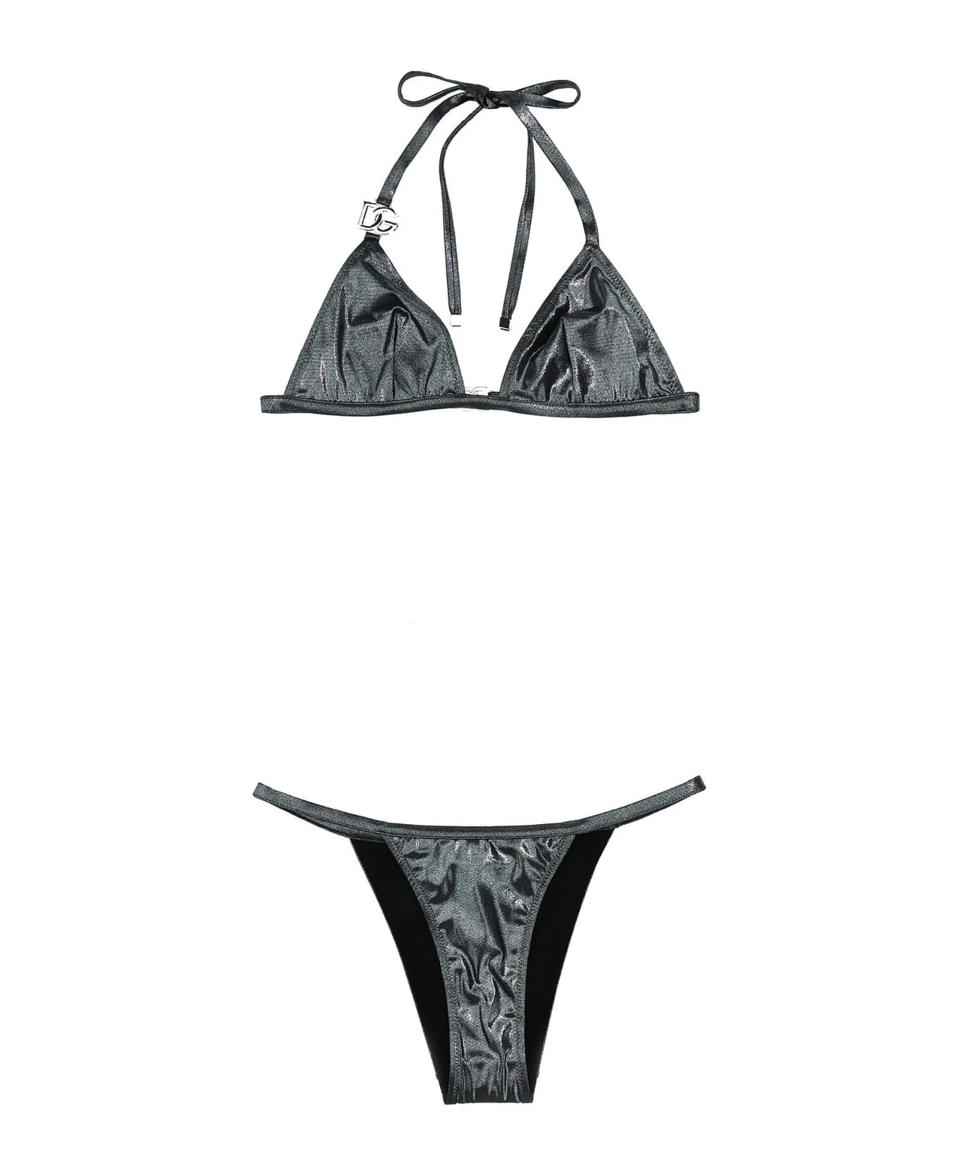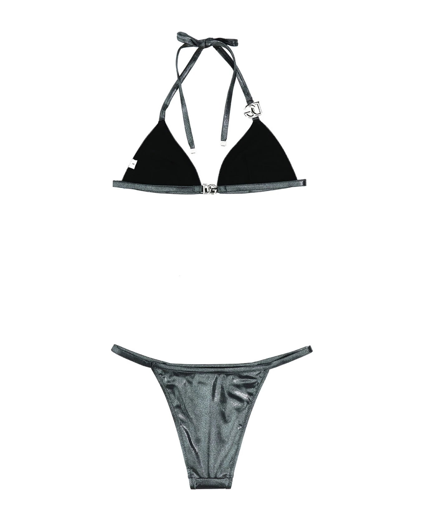 Lamè-effect bikini with triangle top with metal logo and regular briefs.