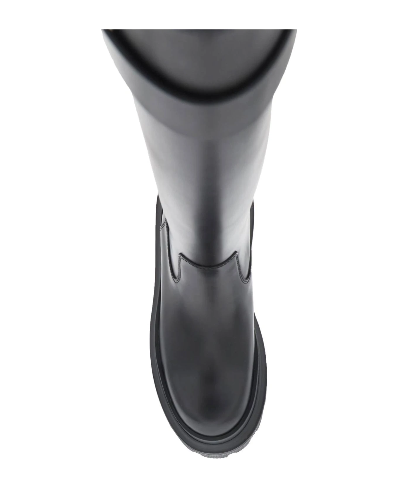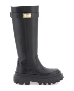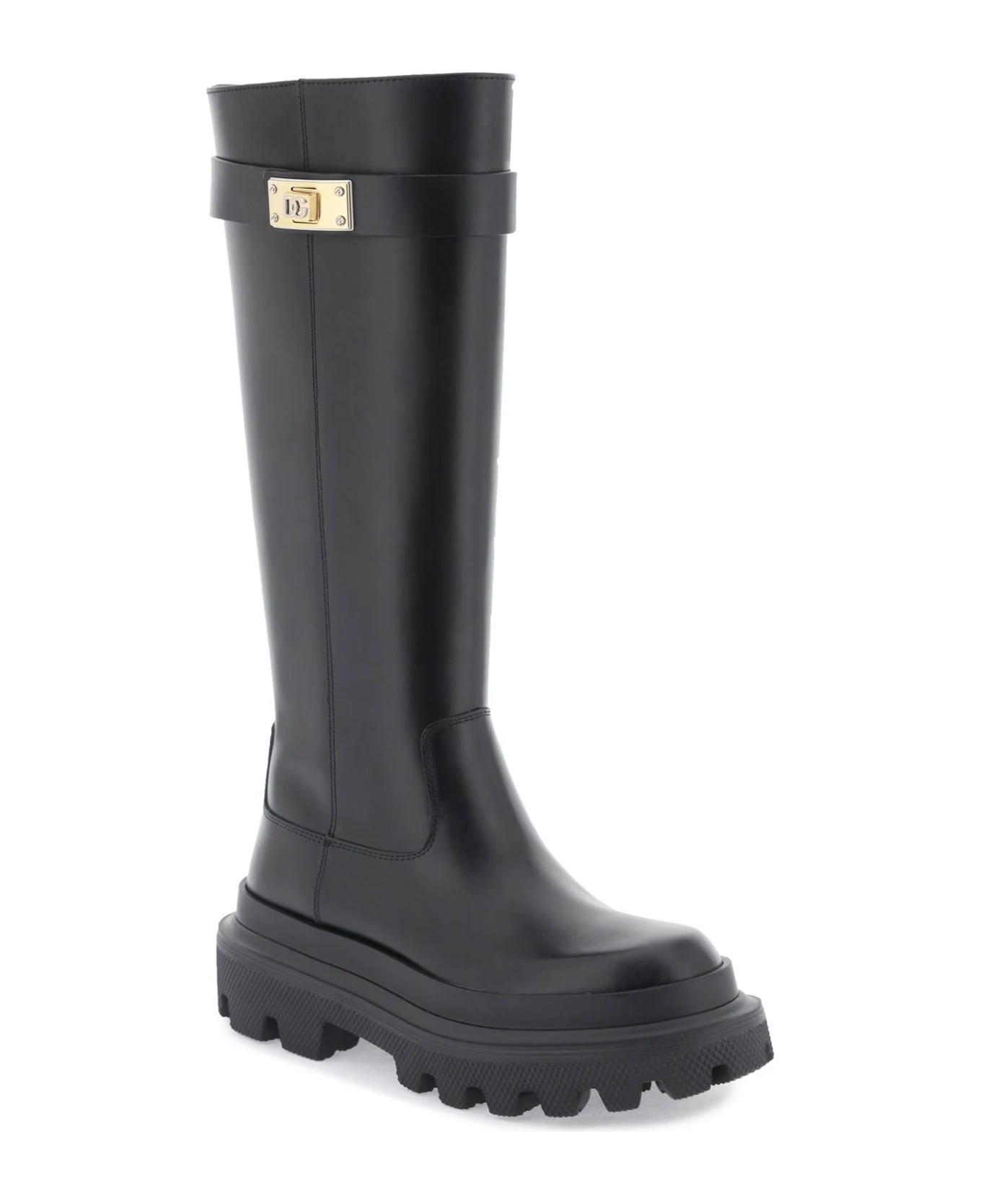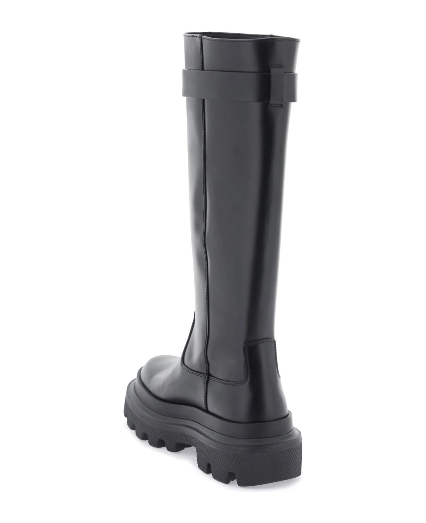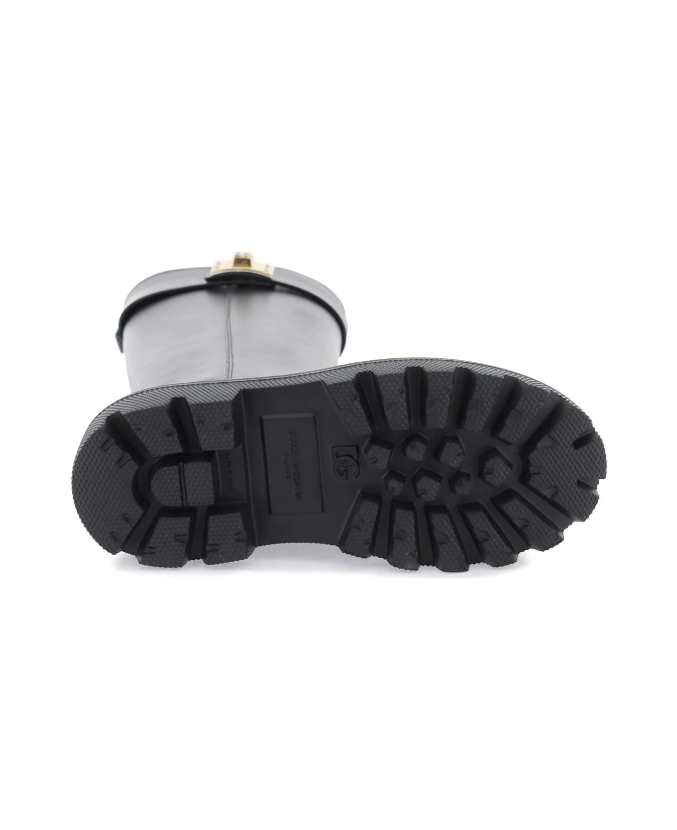 Spazzolato leather boots by Dolce & Gabbana with strap decorated with a gold metal logo plaque. Leather lining and notched rubber sole.