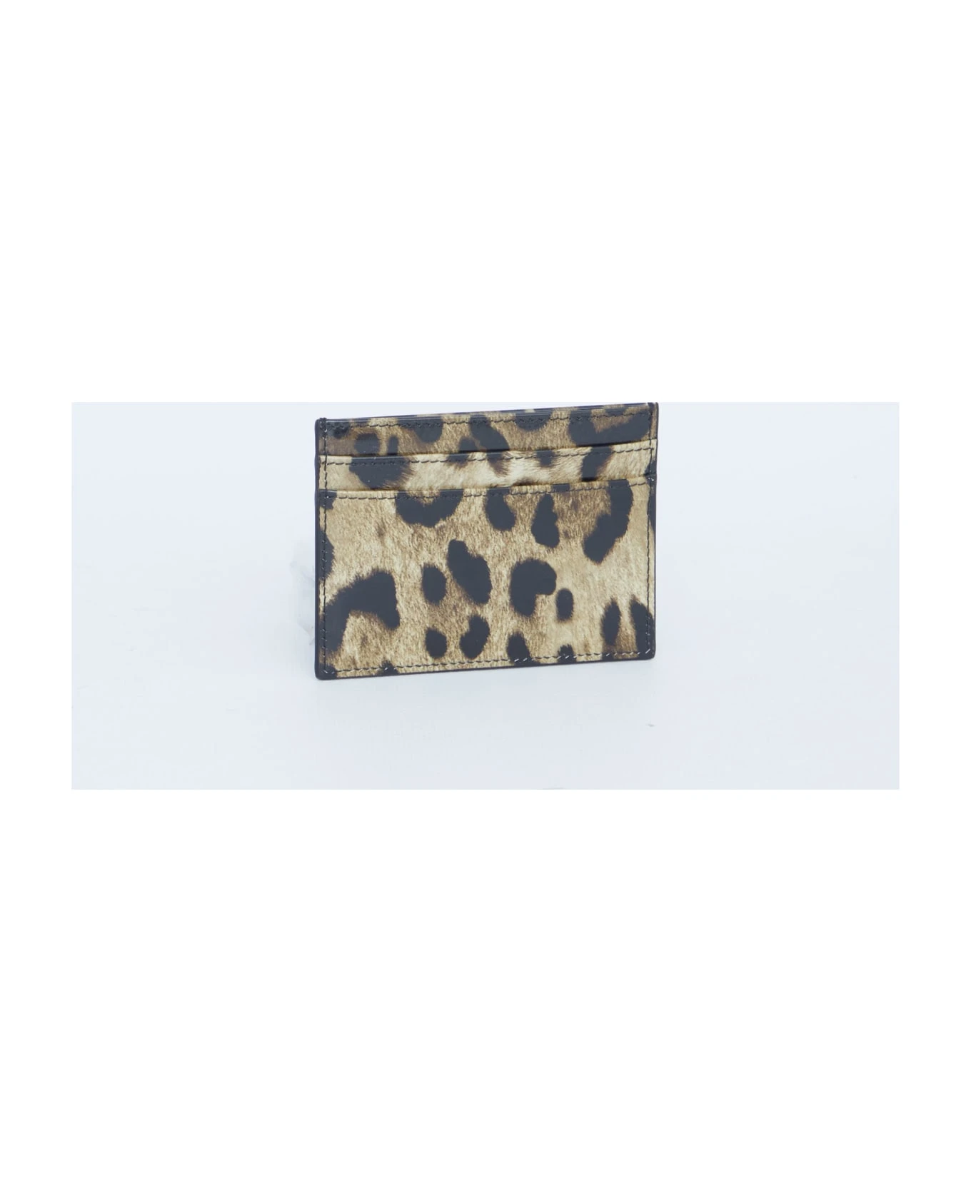 Shiny calfskin cardholder with Leo print. Metallic plate with Dolce & Gabbana logo on the front. Four card slots and one central compartment on top.