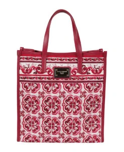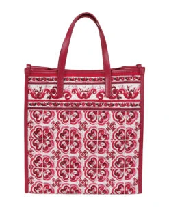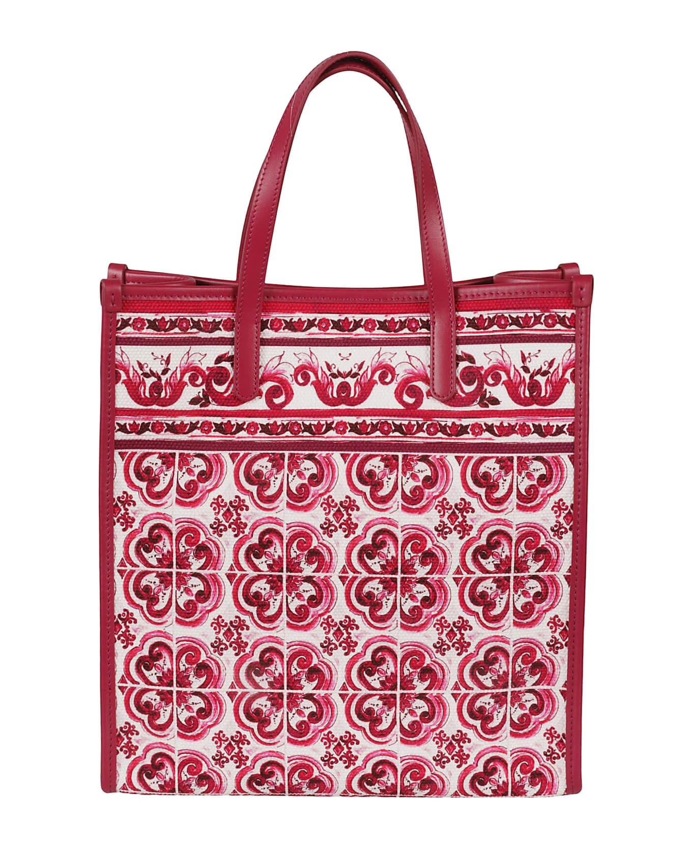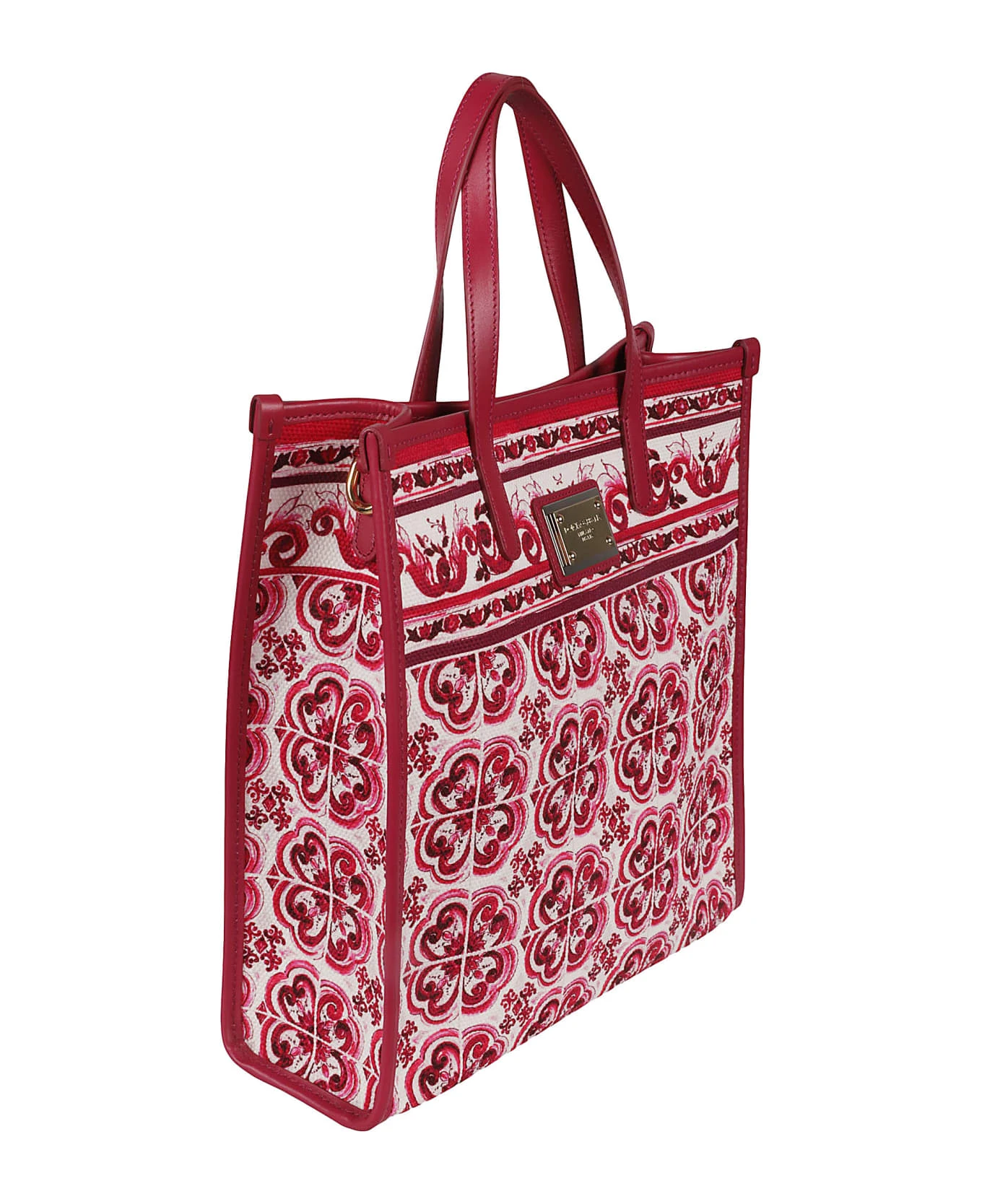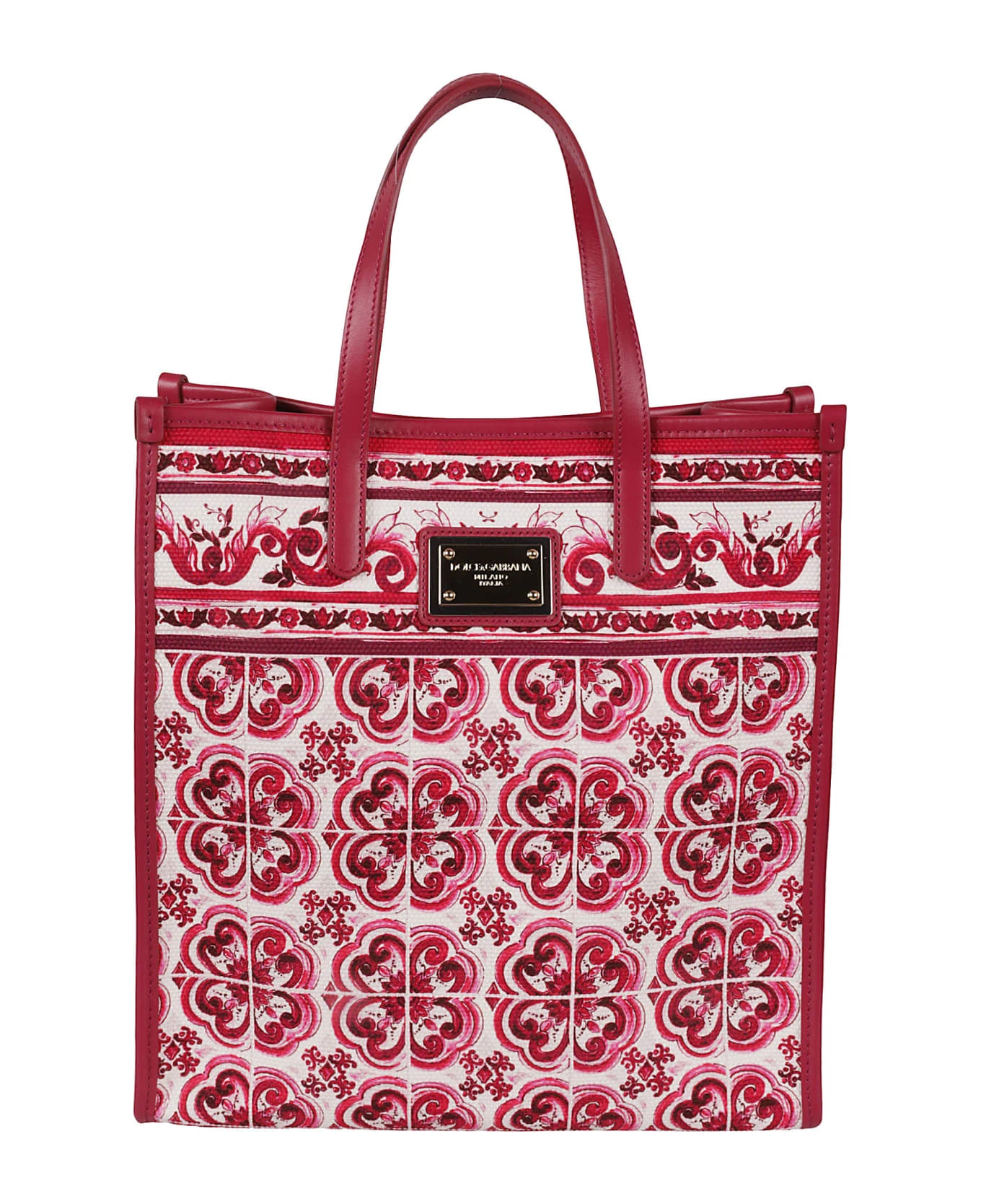 Small Shopping tote bag from DOLCE & GABBANA featuring wine red, fuchsia pink, white, canvas, calf leather, all-over graphic print, gold-tone logo plaque, magnetic fastening, detachable shoulder strap and two long top handles.
