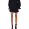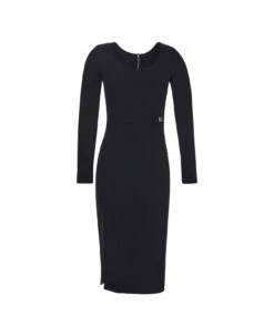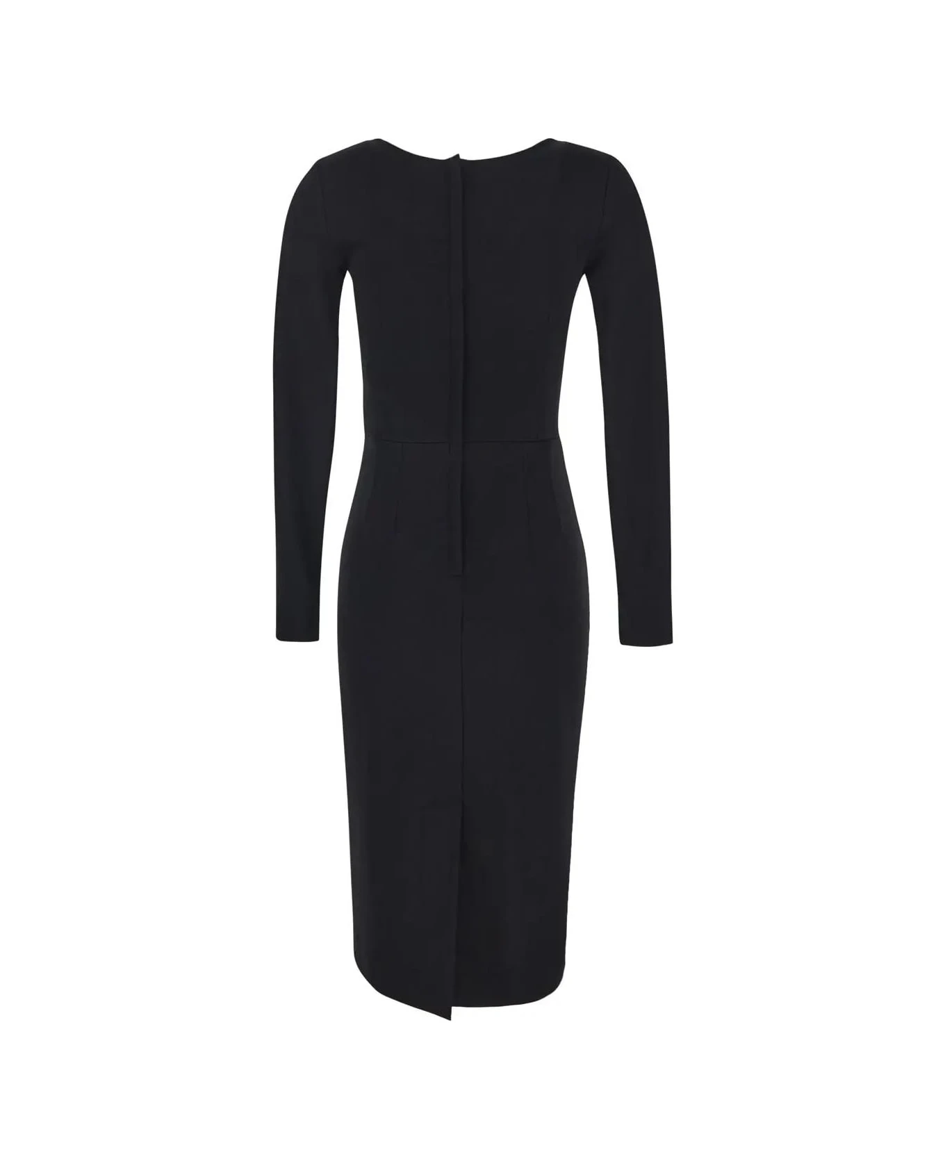Dolce & Gabbana Milano dress in black ribbed viscose blend with mid-calf length, long sleeves, wide round neck, high-waisted, regular fit and silver metallic DG logo monogram at side waist.