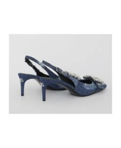 Patchwork Jeans Slingback Sandals in blue cotton denim with crystal buckle on the upper. They feature pointed toe, adjustable ankle strap, thin heel with DG logo and leather sole.