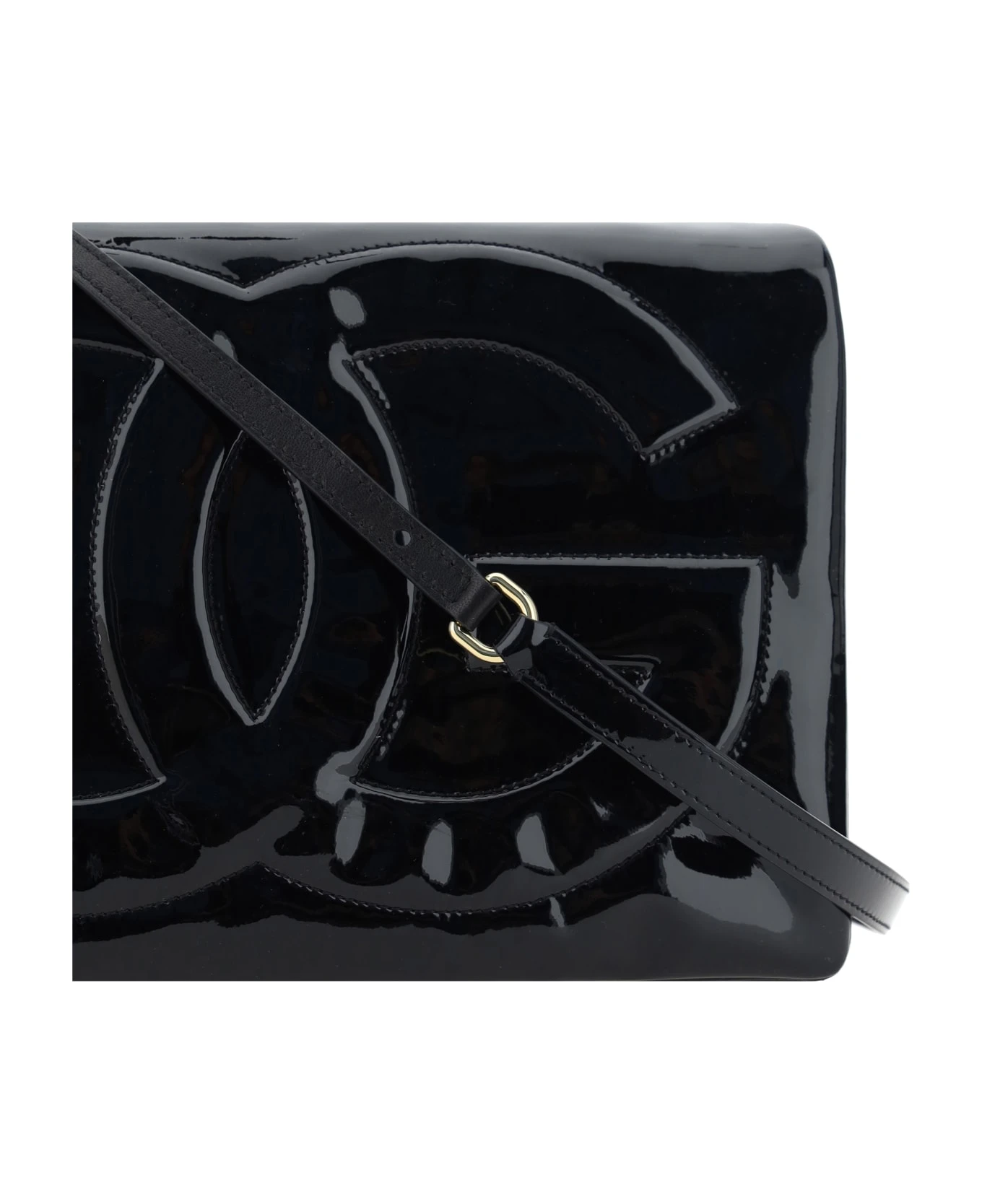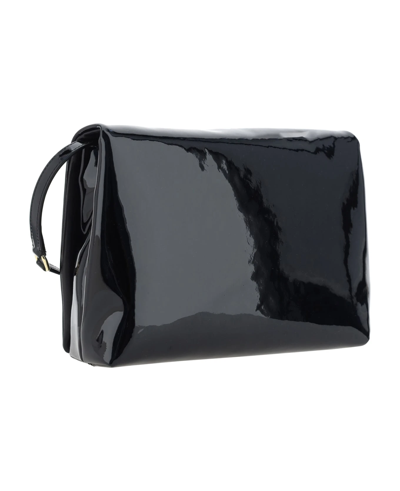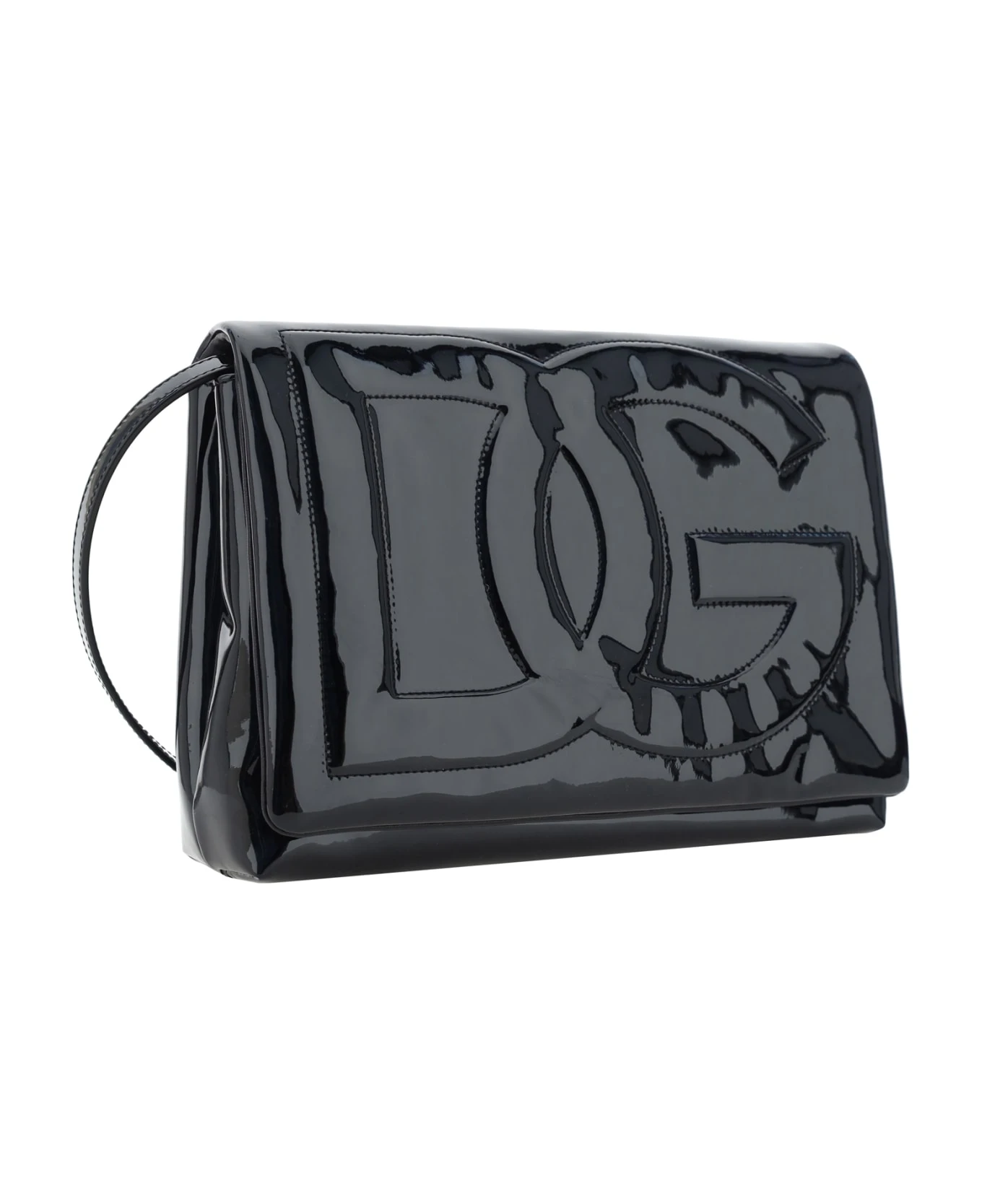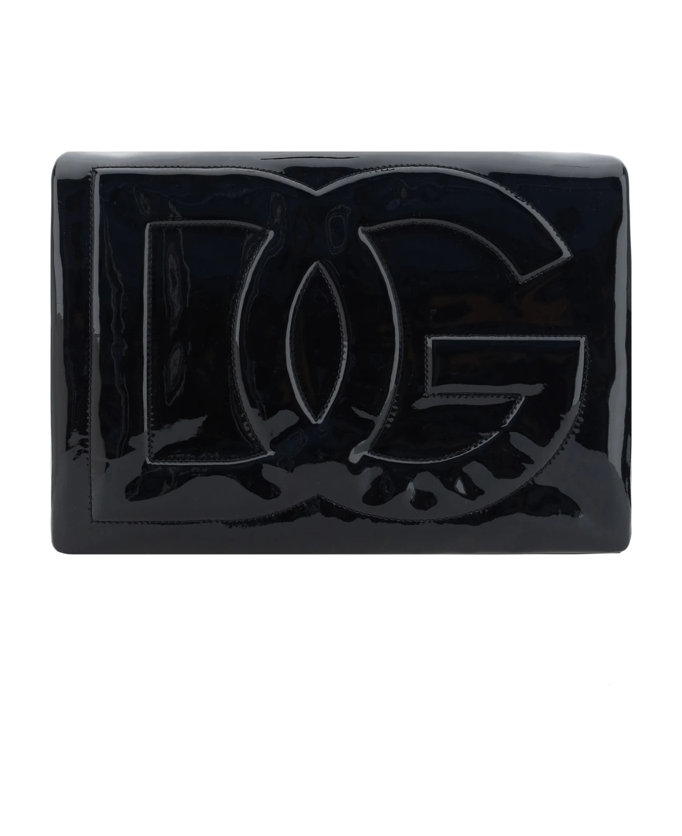 Calfskin patent shoulder bag by dolce&gabbana, flat strap adjustable by buckle at top, iconic embossed d&g logo on front, front closure by magnetic flap, inside welt pocket with zipper for closure, patent leather design.