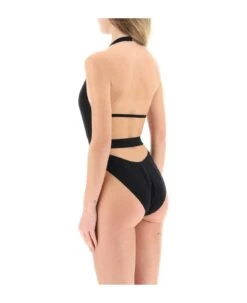 Dolce&Gabbana one-piece swimsuit in stretch technical fabric featuring a plunging V-neckline and elastic belt with gold-tone metal logo buckle. Hook closure at rear neck and on the back. The model is 177 cm tall and wears a size 1.