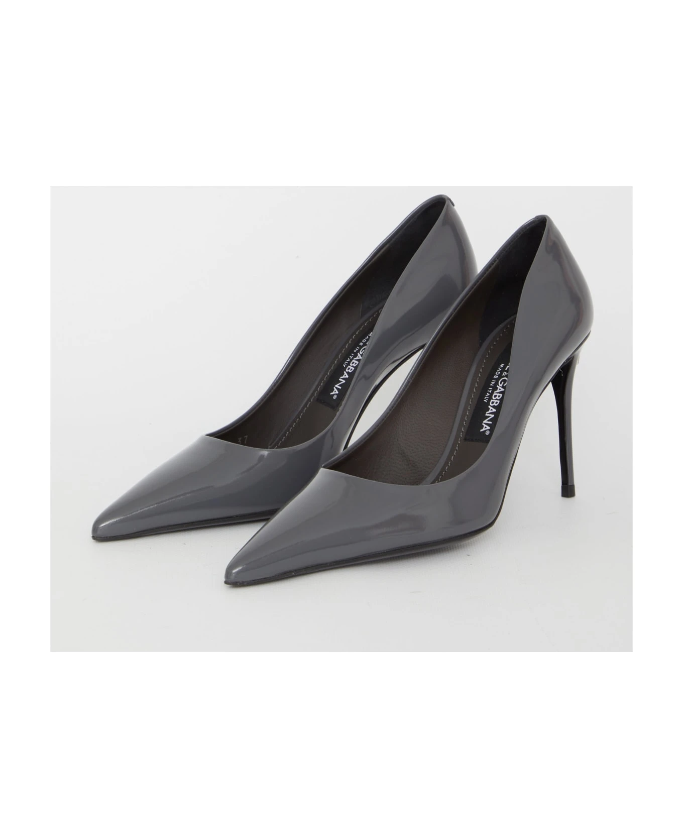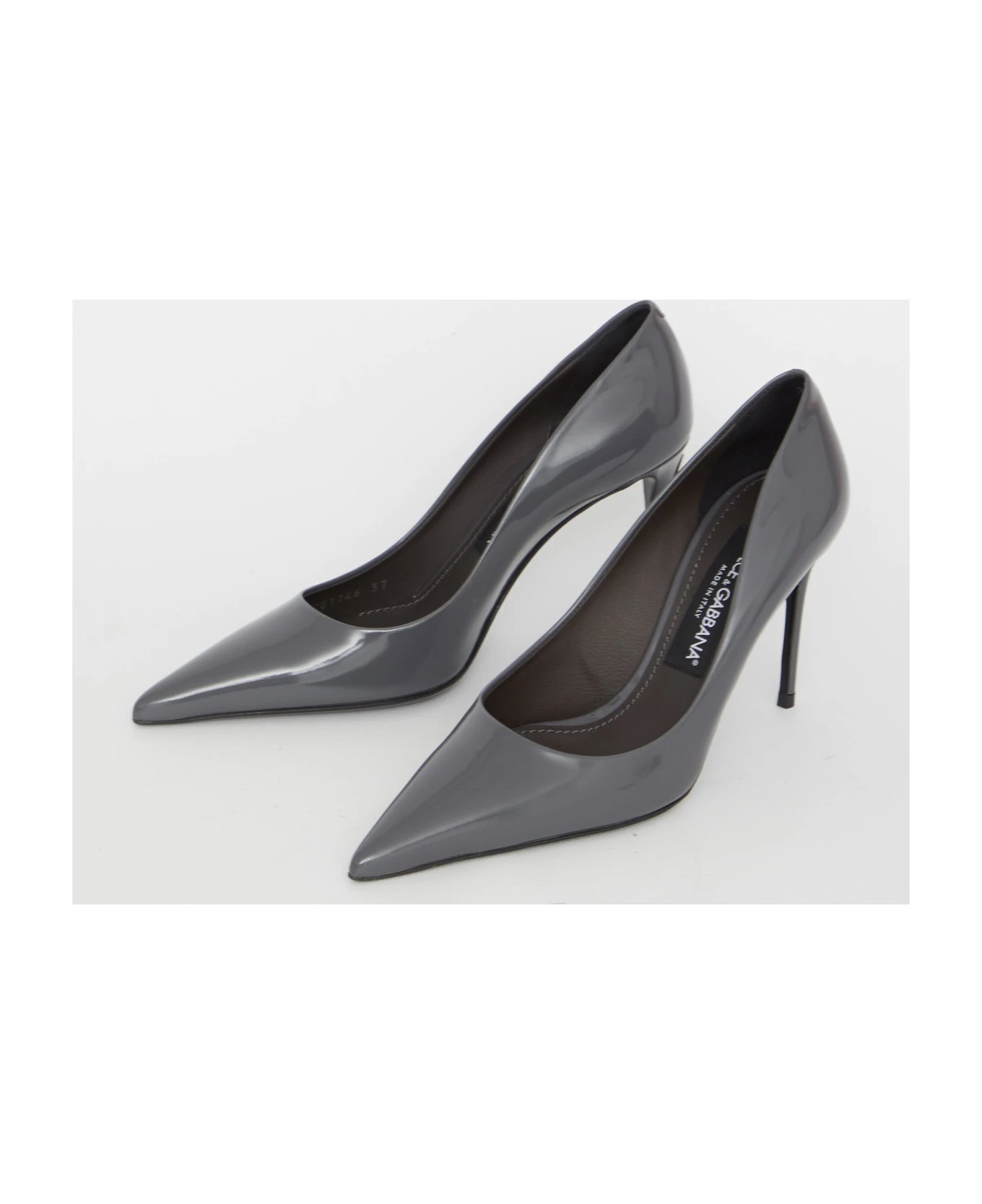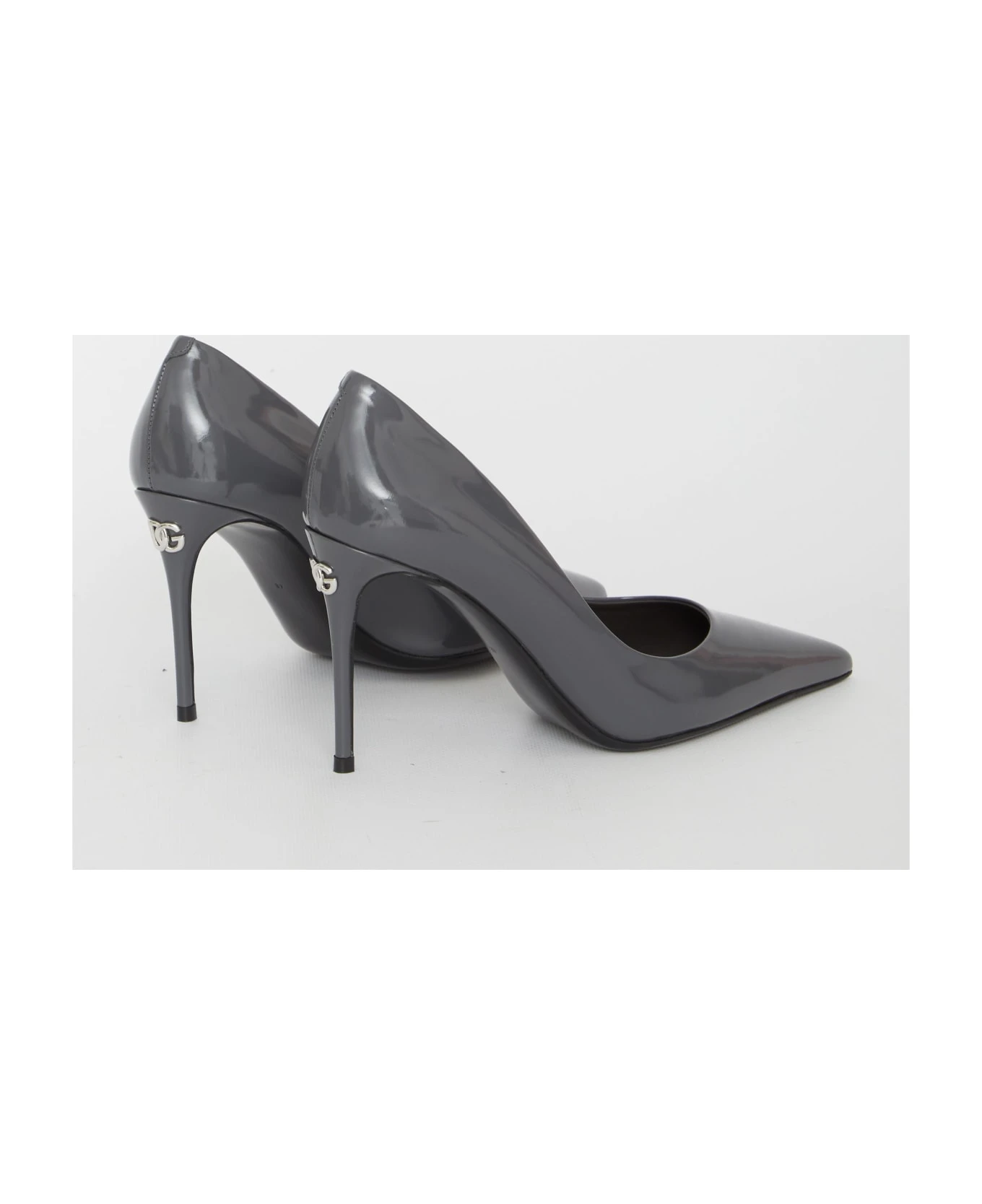 Lollo pumps in grey polished calfskin with silver-tone metal DG logo at the back of the heel. Pointed design, embossed Dolce & Gabbana logo on the insole and stiletto heel. Leather sole.