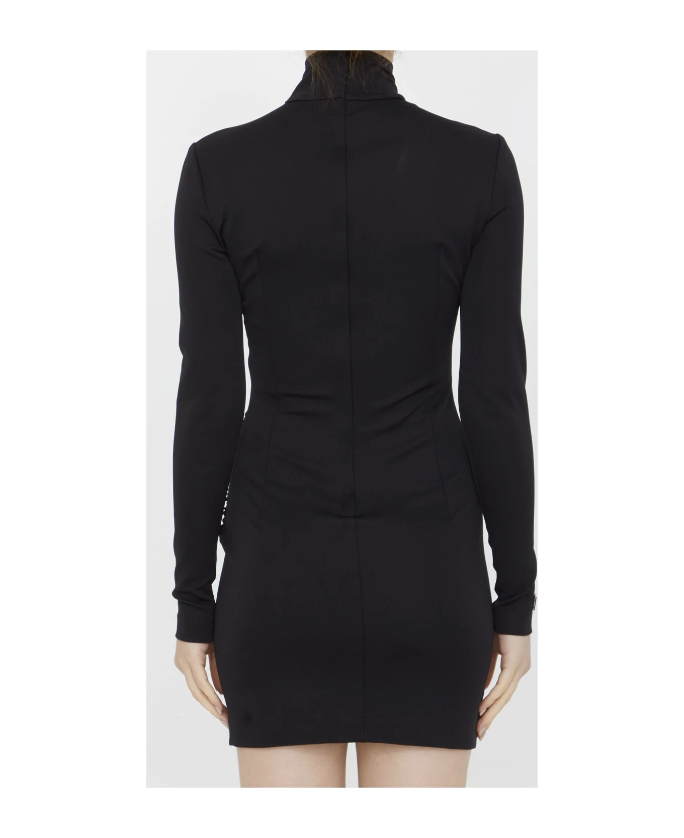 High-neck short black jersey Milano rib dress. Rear zip closure. DG detail on right sleeve. Tight fit.