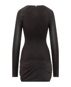 Short black dress. Long sleeves. Cut-out on the chest. bow on the neck and skirt. Zip closure.