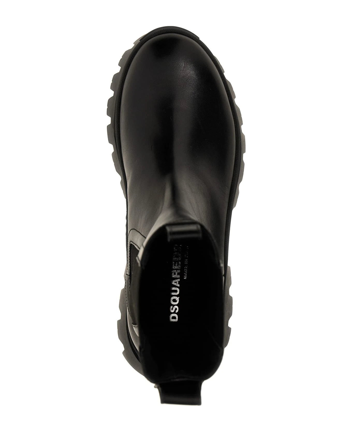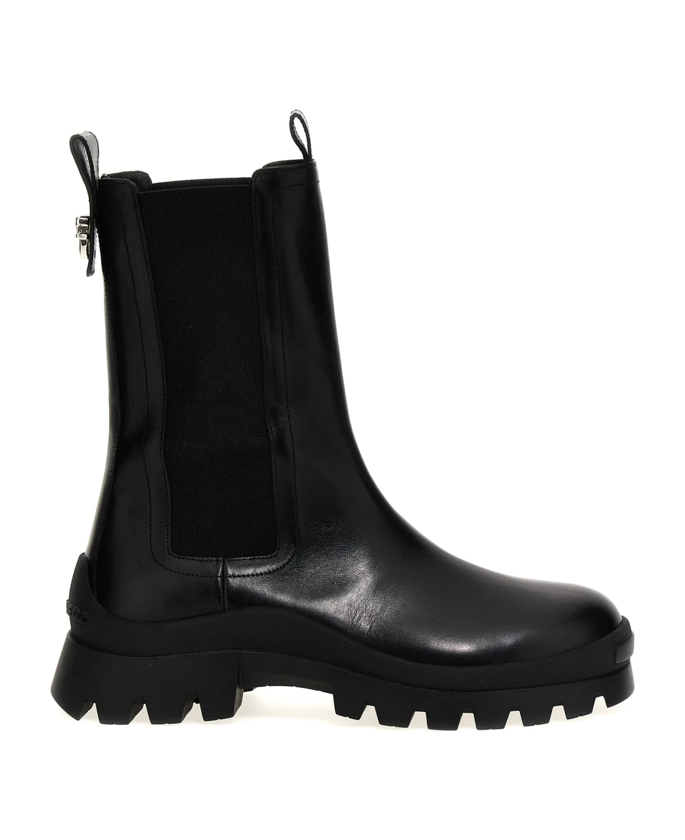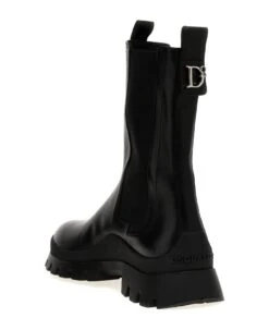 ‘D2 Statement’ leather ankle boots with back metal logo, elastic ankle strap, rubber sole.