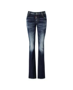 Dsquared2 Twiggy jeans made of dark-wash stretch cotton denim, featuring washed-out effect details and five-pocket design. Medium waist, fitted leg with flared bottom. Zip and button closure decorated with logoed label. Composition: 98% cotton, 2% elastane.