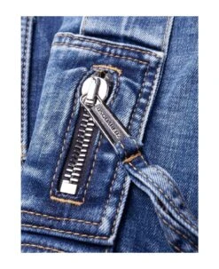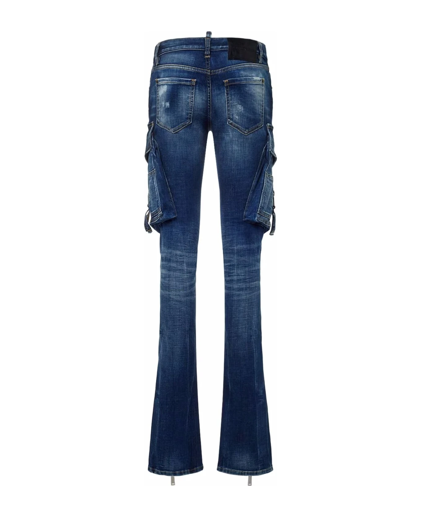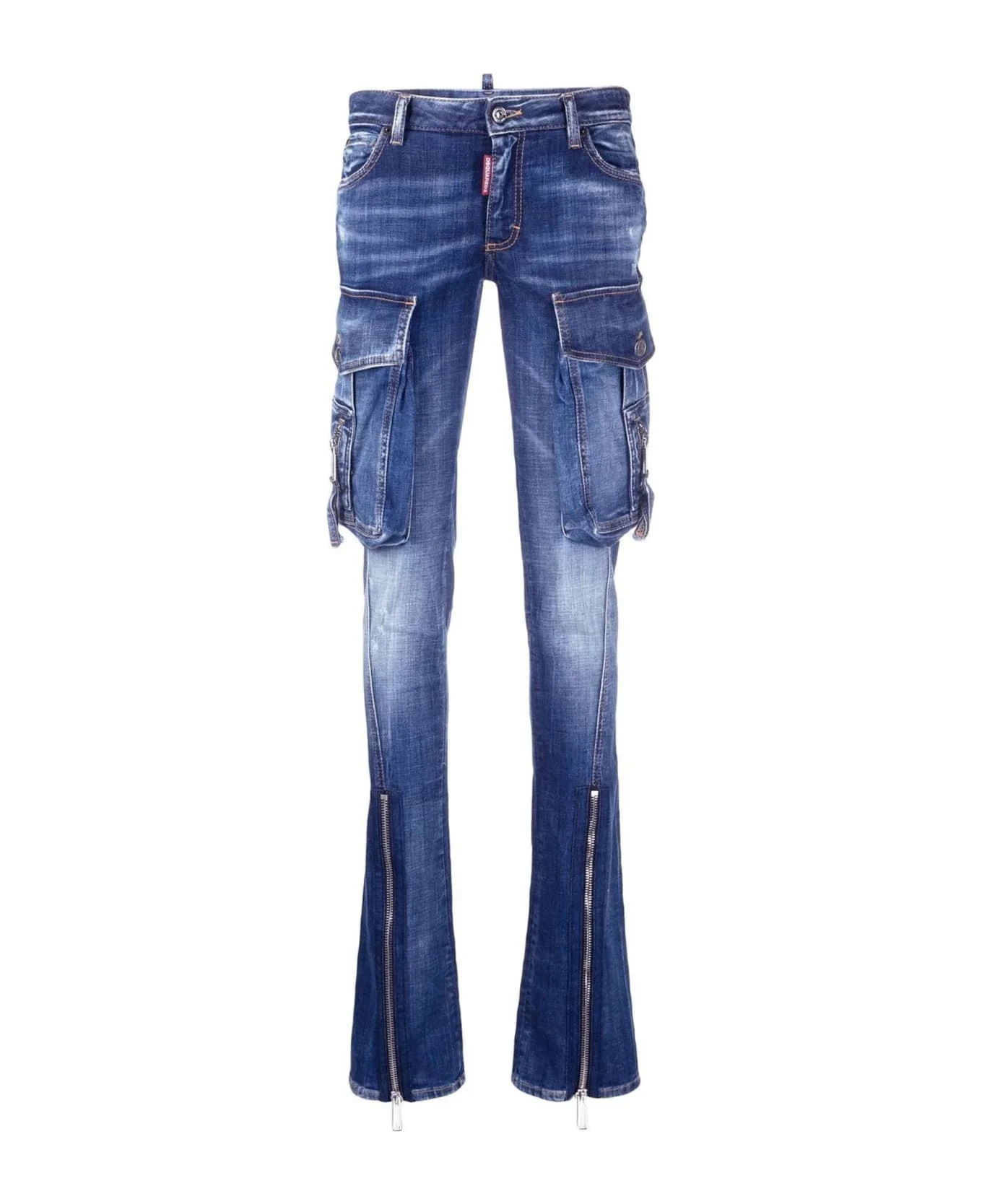 Indigo blue stretch-cotton denim jeans, low-rise, multiple cargo pockets, belt loops, front button and zip fastening, slight flare, ankle zips