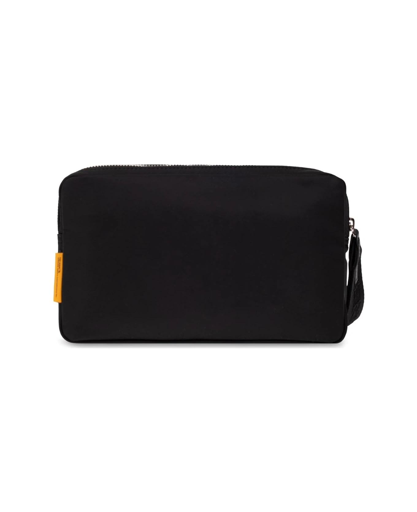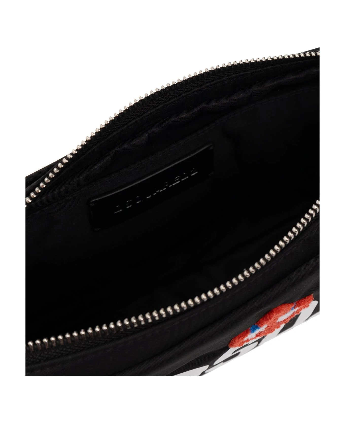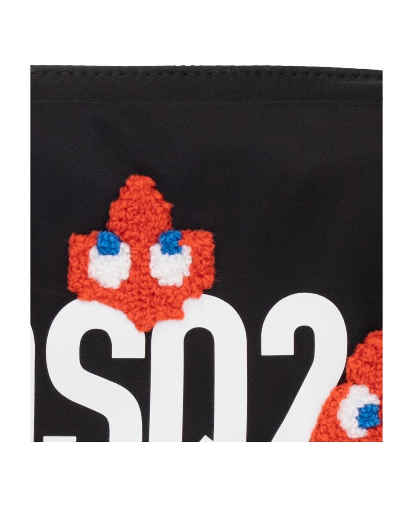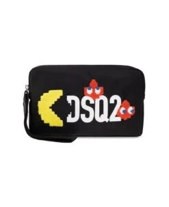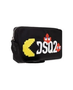Black handbag from Dsquared2 x PAC-MAN. Embellished with a graphic print and logo patch, this design fastens with a zip and features a wrist strap, silver-tone metal hardware and one internal compartment with a slip pocket.