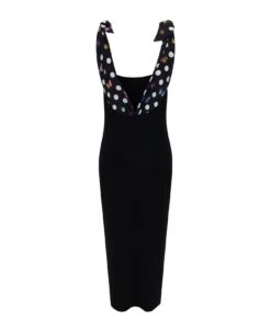 Dress by dua lipa x versace, wide v-neck front, contrasting straps and bust, iconic branded graphic polka dot pattern, tie-back straps, midi length, slight all-over perforated detailing, embossed plaque with iconic medusa appliqué on straps, regular fit. “la vacanza” collection by dua lipa x versace.