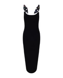 Dress by dua lipa x versace, wide v-neck front, contrasting straps and bust, iconic branded graphic polka dot pattern, tie-back straps, midi length, slight all-over perforated detailing, embossed plaque with iconic medusa appliqué on straps, regular fit. “la vacanza” collection by dua lipa x versace.
