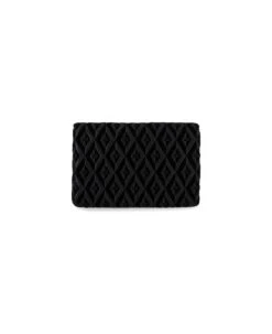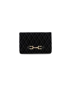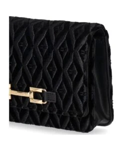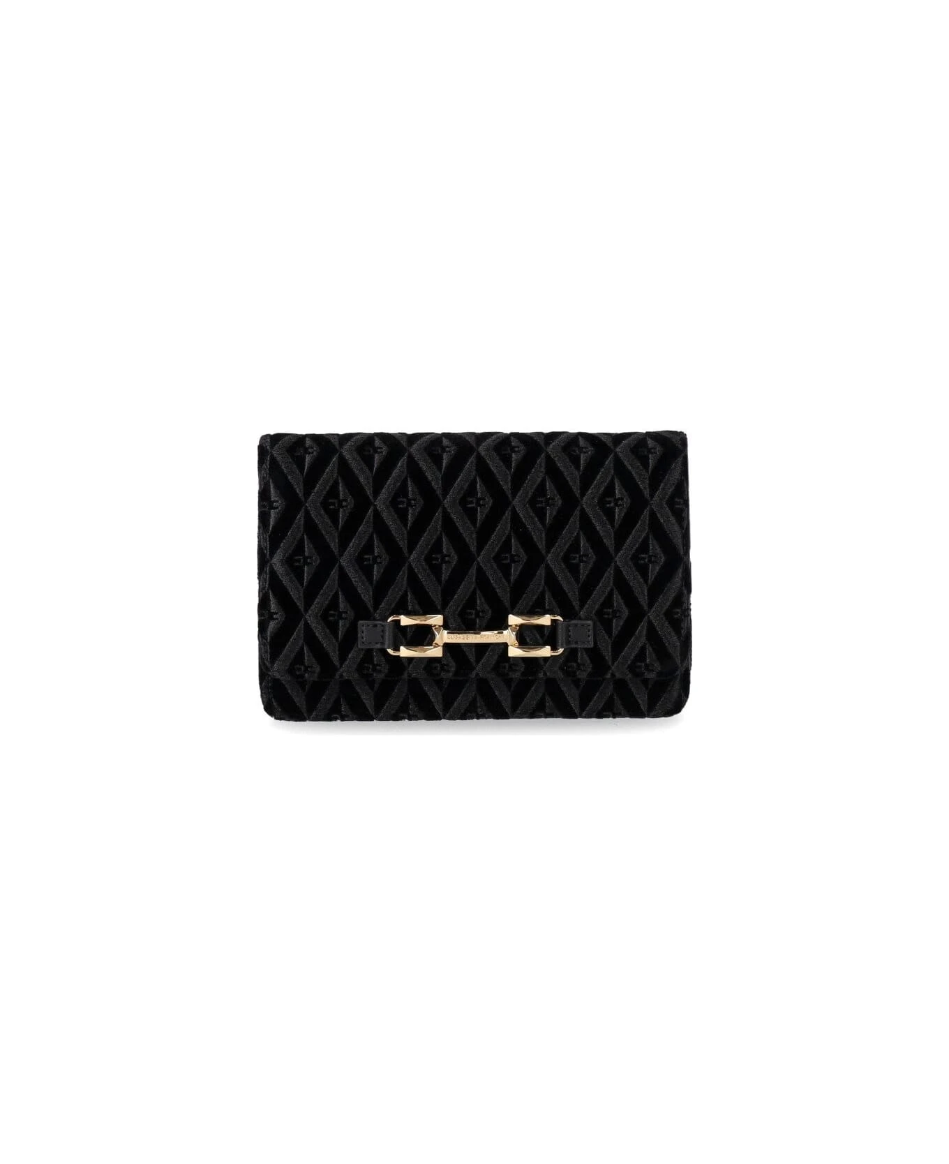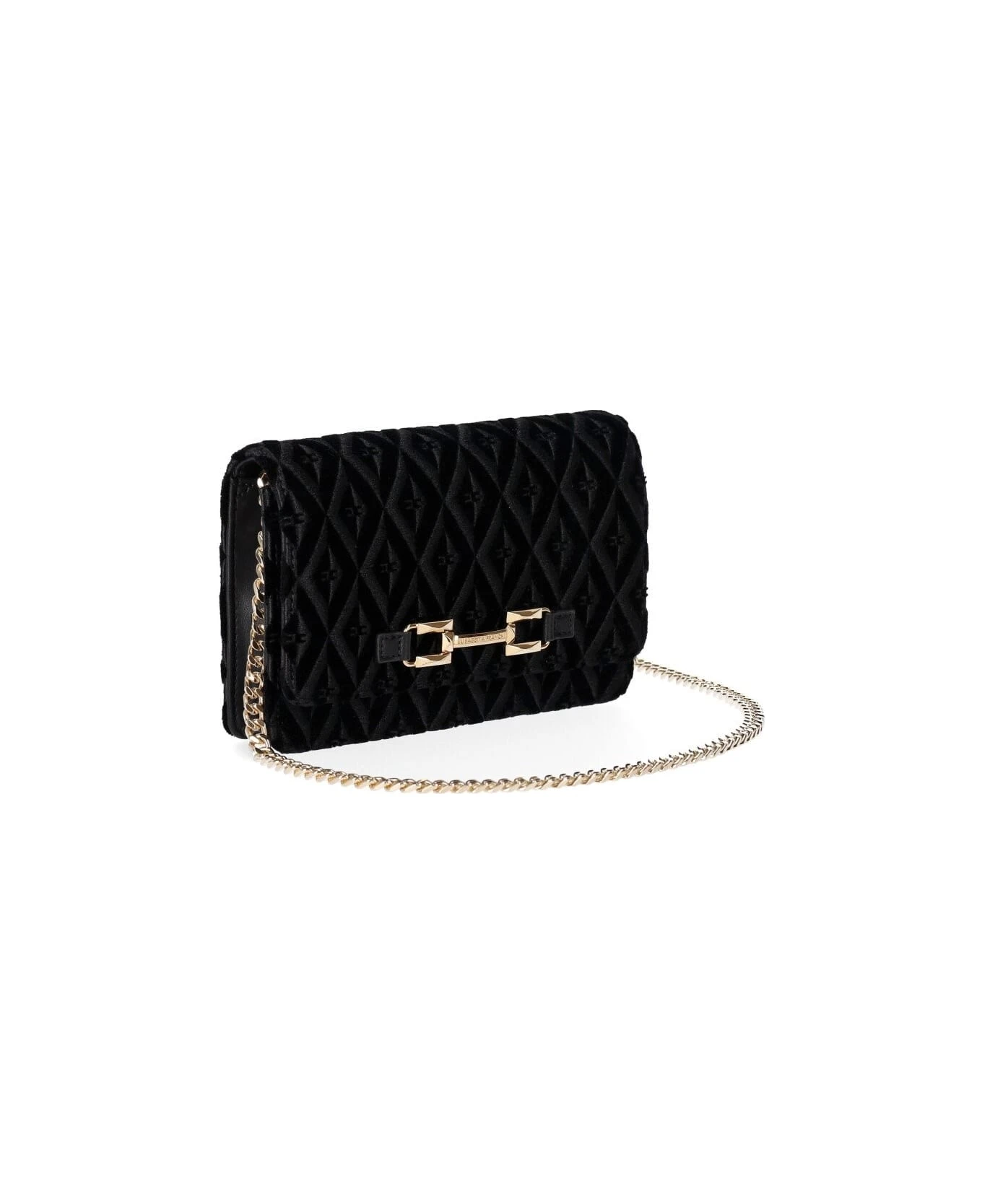 Velvet shoulder strap with all-over logo pattern, magnetic closure, front chain detail, and removable chain shoulder strap.