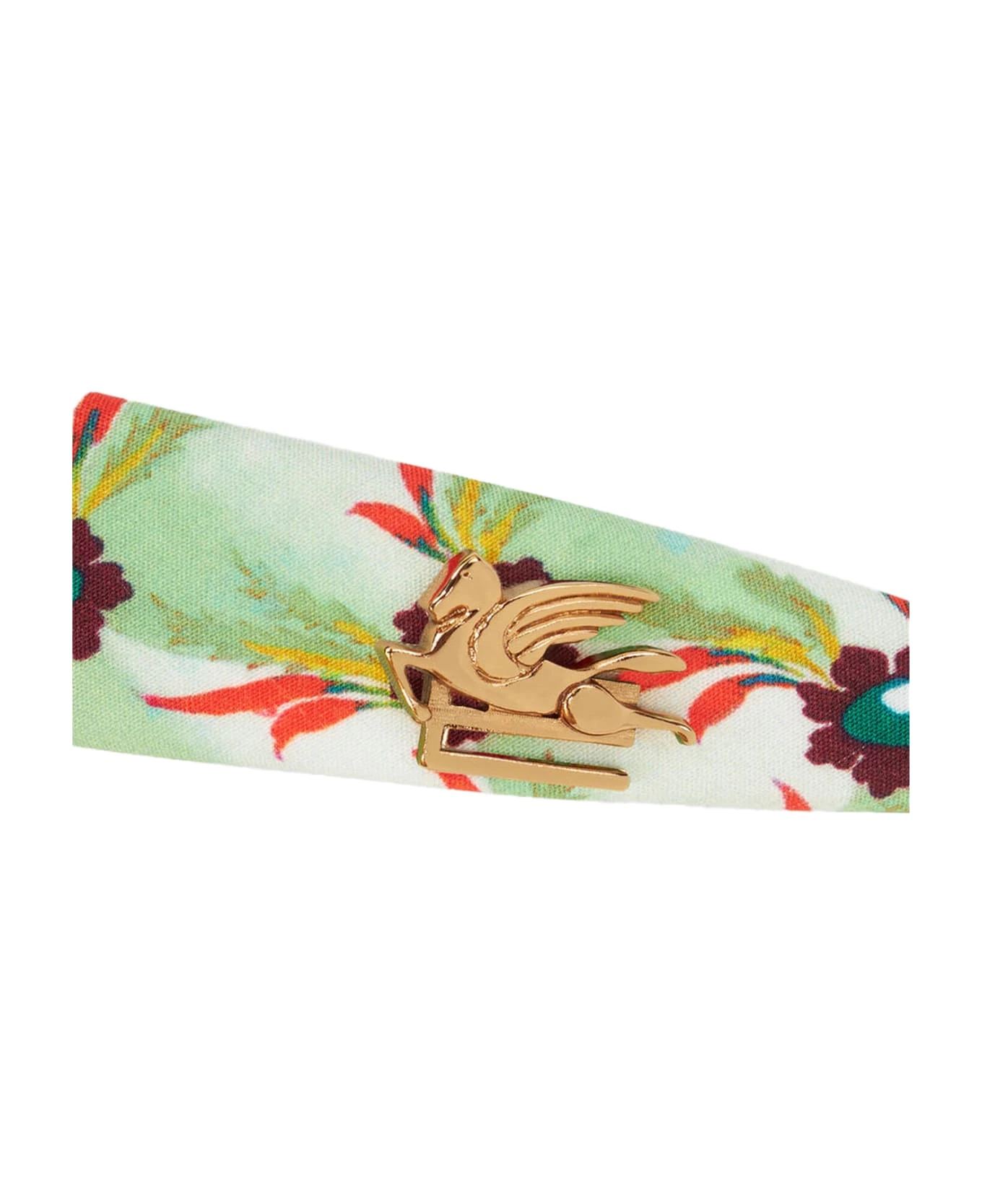Green Etro headband made of silk and decorated with a colorful Floralia print.