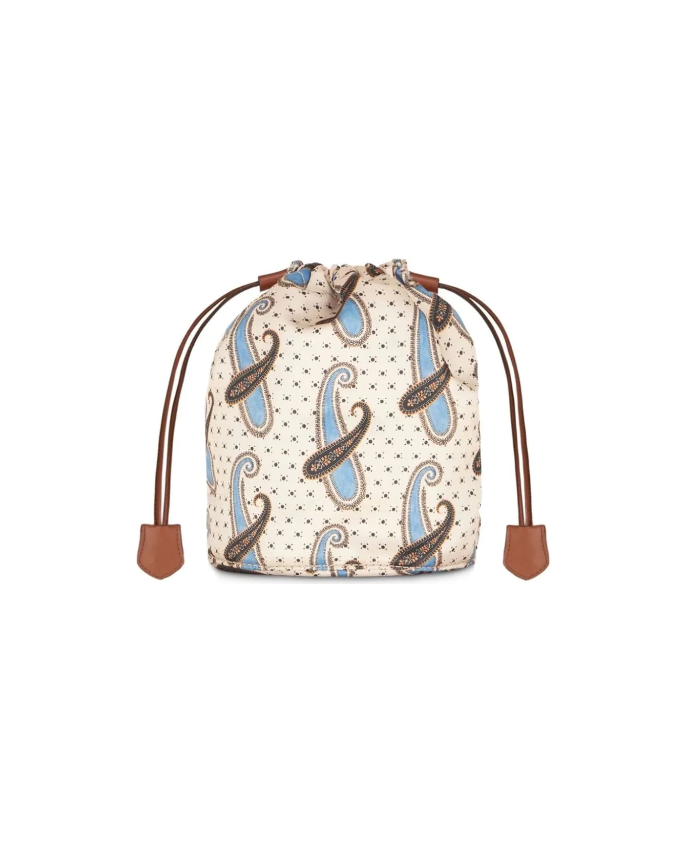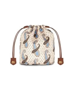 Etro pouch made of fabric decorated with Paisley patterns and micro polka dots and featuring brown leather drawstring with Etro and Pegasus logo. The Pouch can be used as a hand bag. Metallic accessories with light gold finish.