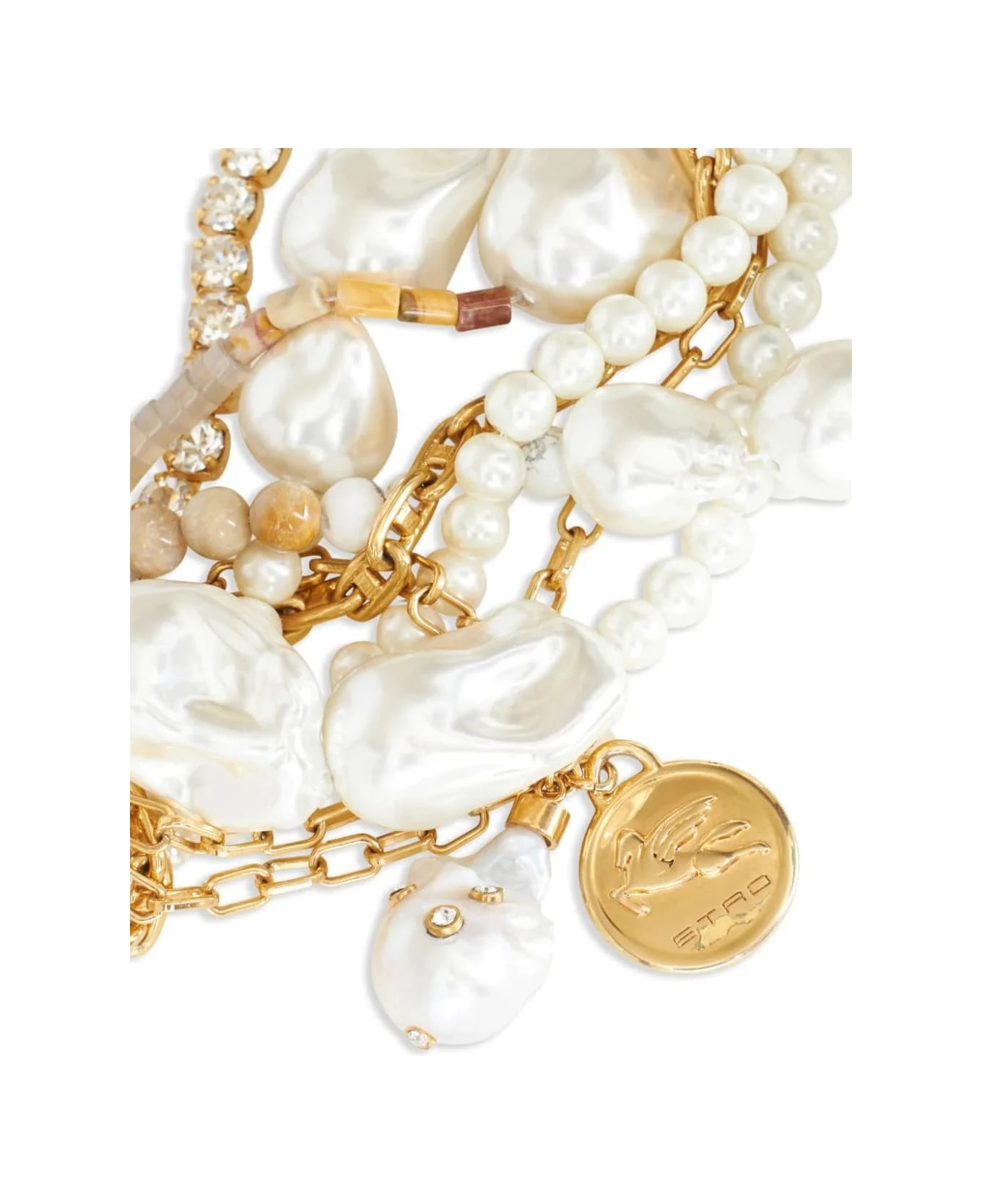 Etro necklace with multi-pearl and pendant strands featuring a medal with the Etro and Pegaso logo.