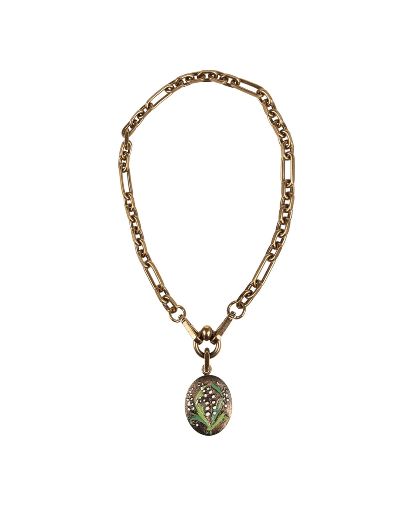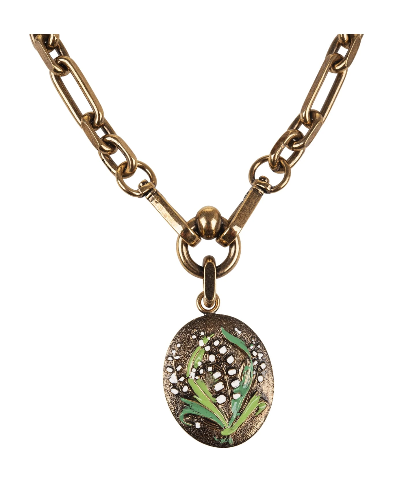 Etro chain necklace made of antiqued brass with an oval pendant embellished with a colourful lily of the valley decoration.