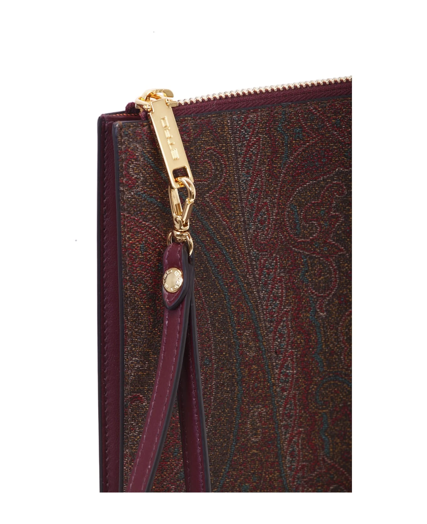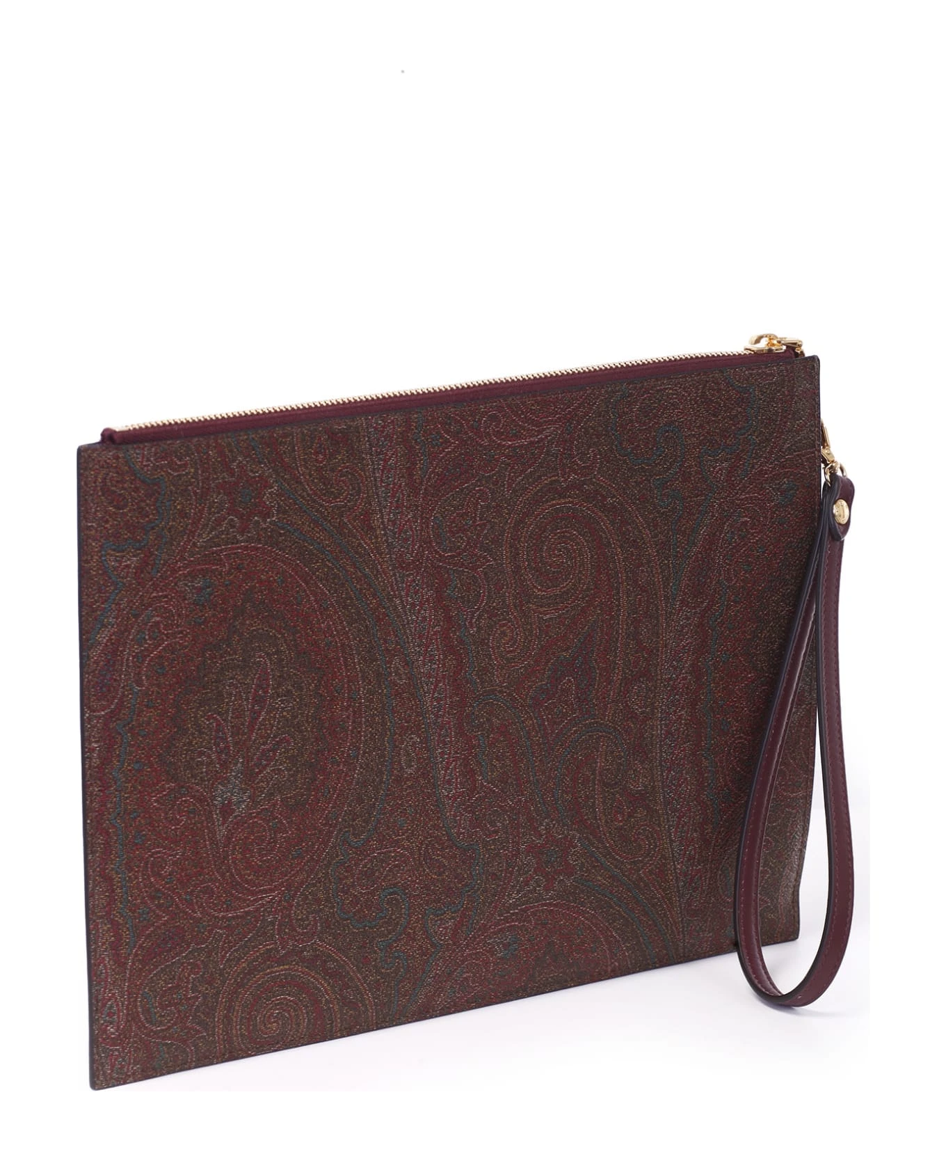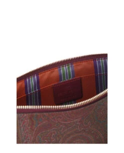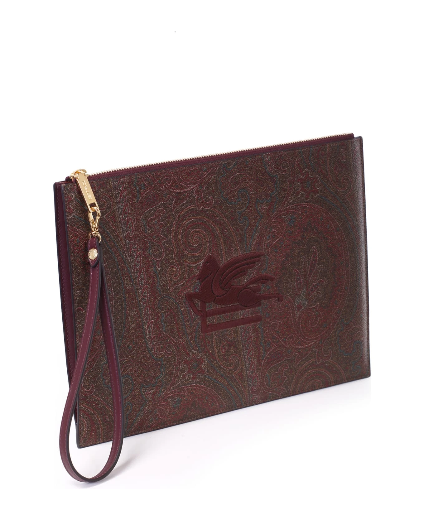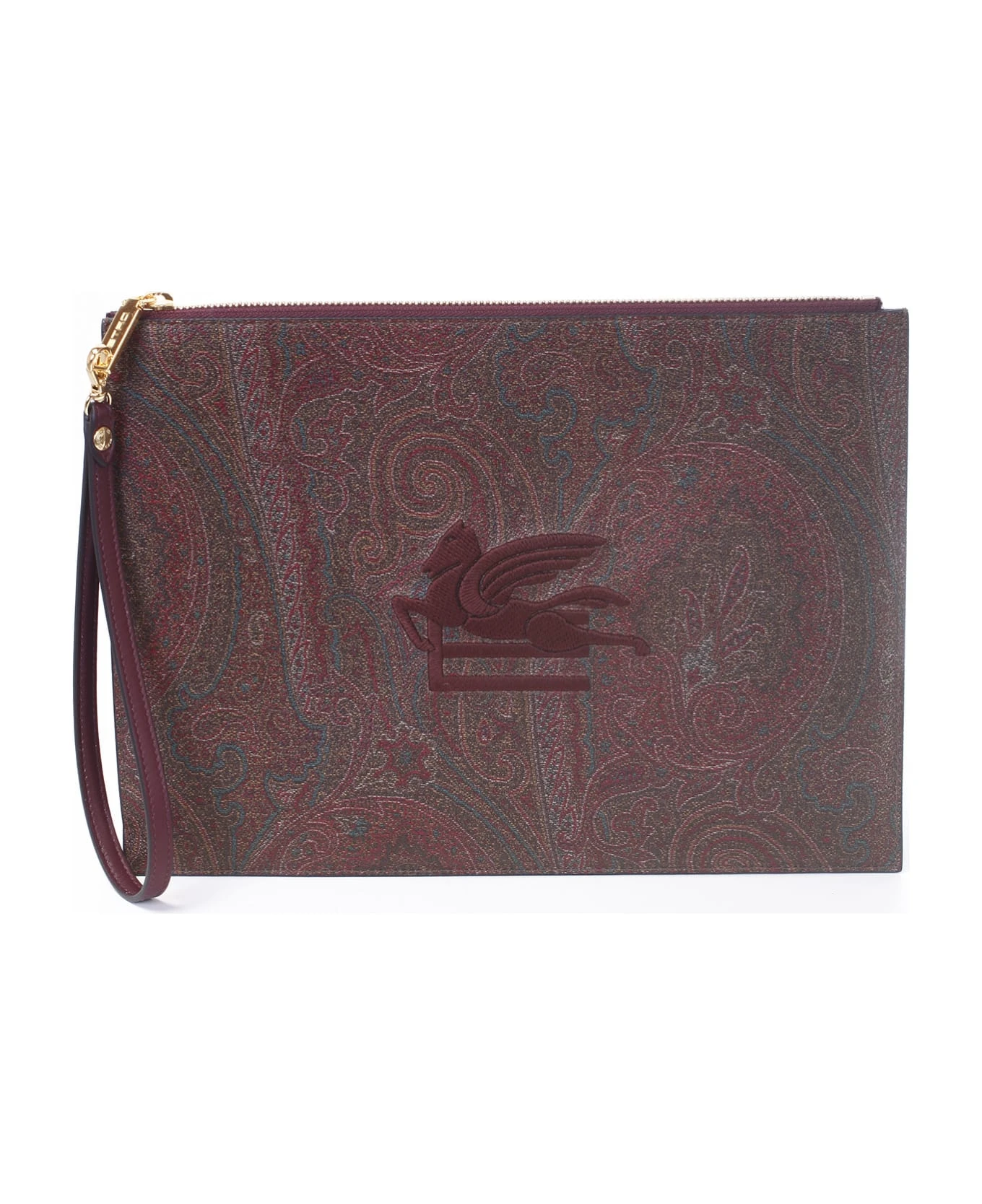 Etro pouch maxi, made in the iconic Paisley jacquard fabric and characterized by the ETRO Pegaso logo embroidered in thread with a three-dimensional effect. Removable wrist strap. Dimensions: 32 x 24cm. Exterior: Paisley jacquard cotton fabric coated with matte grain and doubled in canvas. Finishes: 100% calf leather. Inside: 100% polyester. Zip closure. Internal patch pocket. Removable wrist strap height (light) 18 cm. Metallic accessories with golden finish. Made in Italy.
