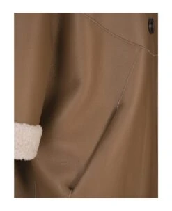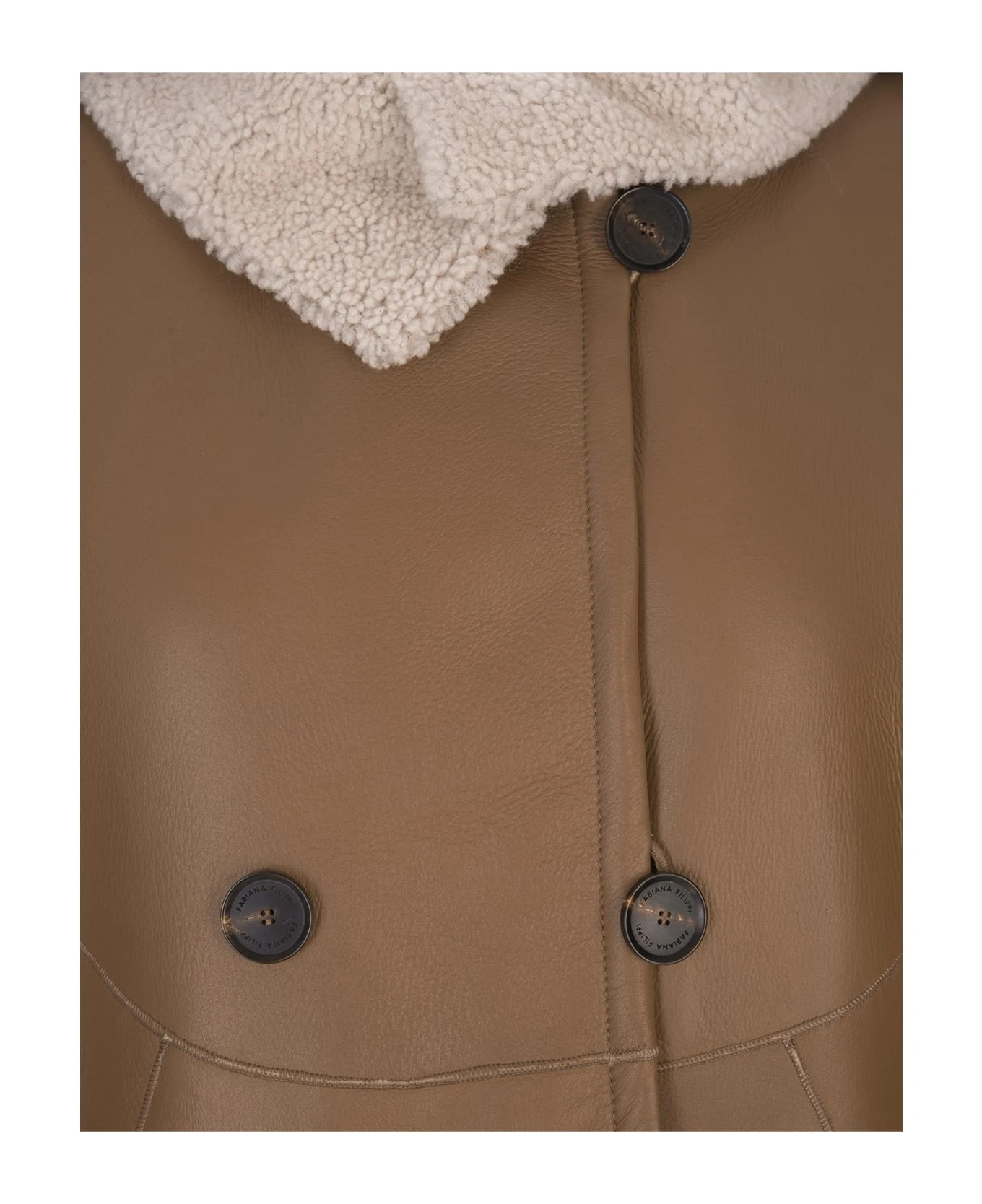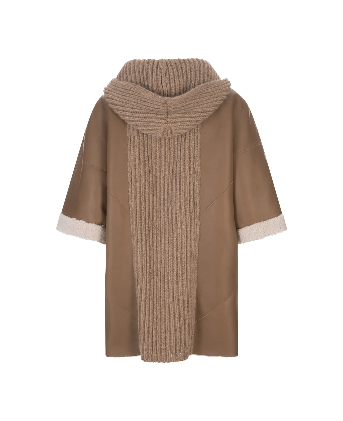 Fabiana Filippi over-fit cape made of camel-colored shearling and featuring back detail and knit hood. Seasonal must-have.