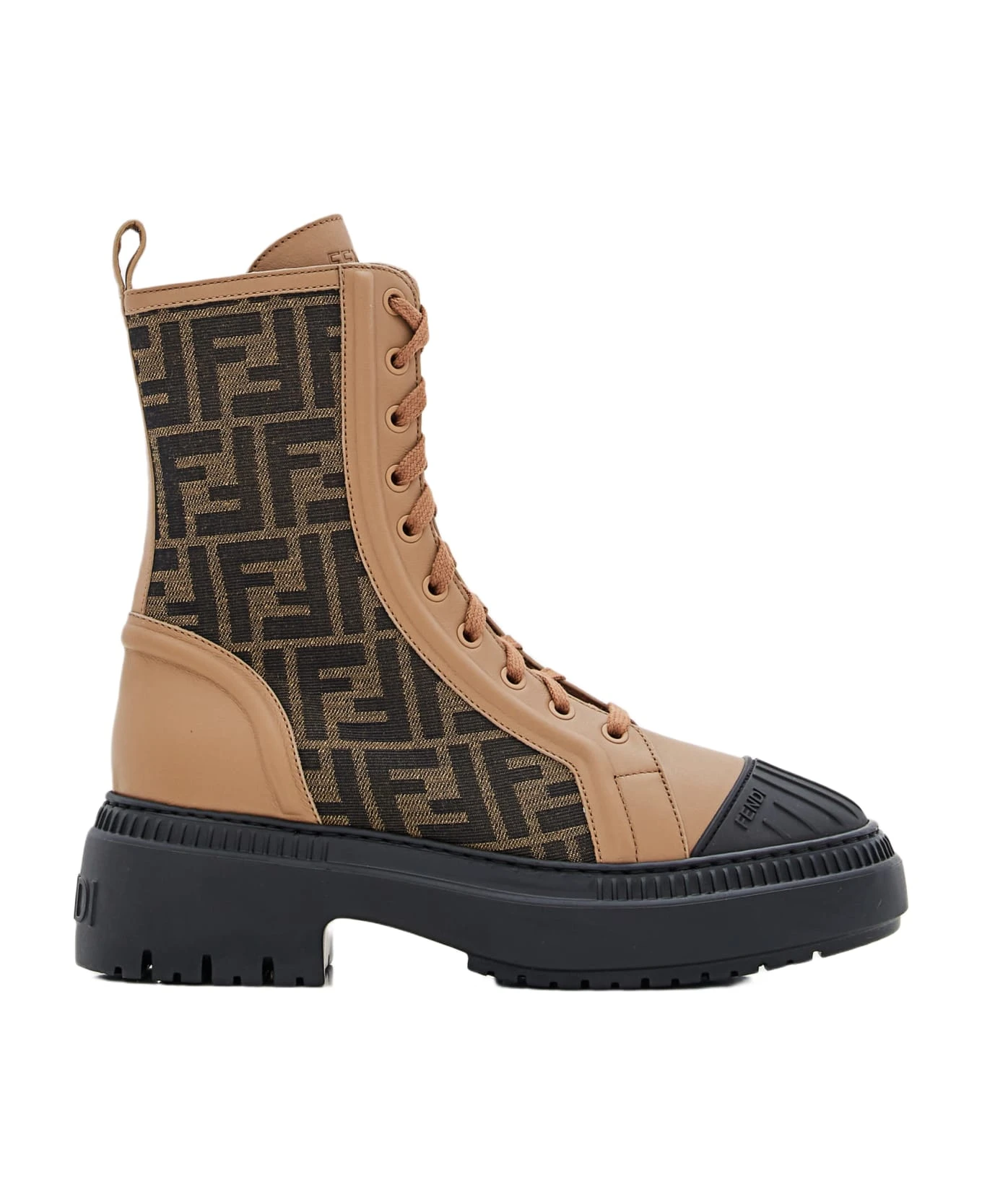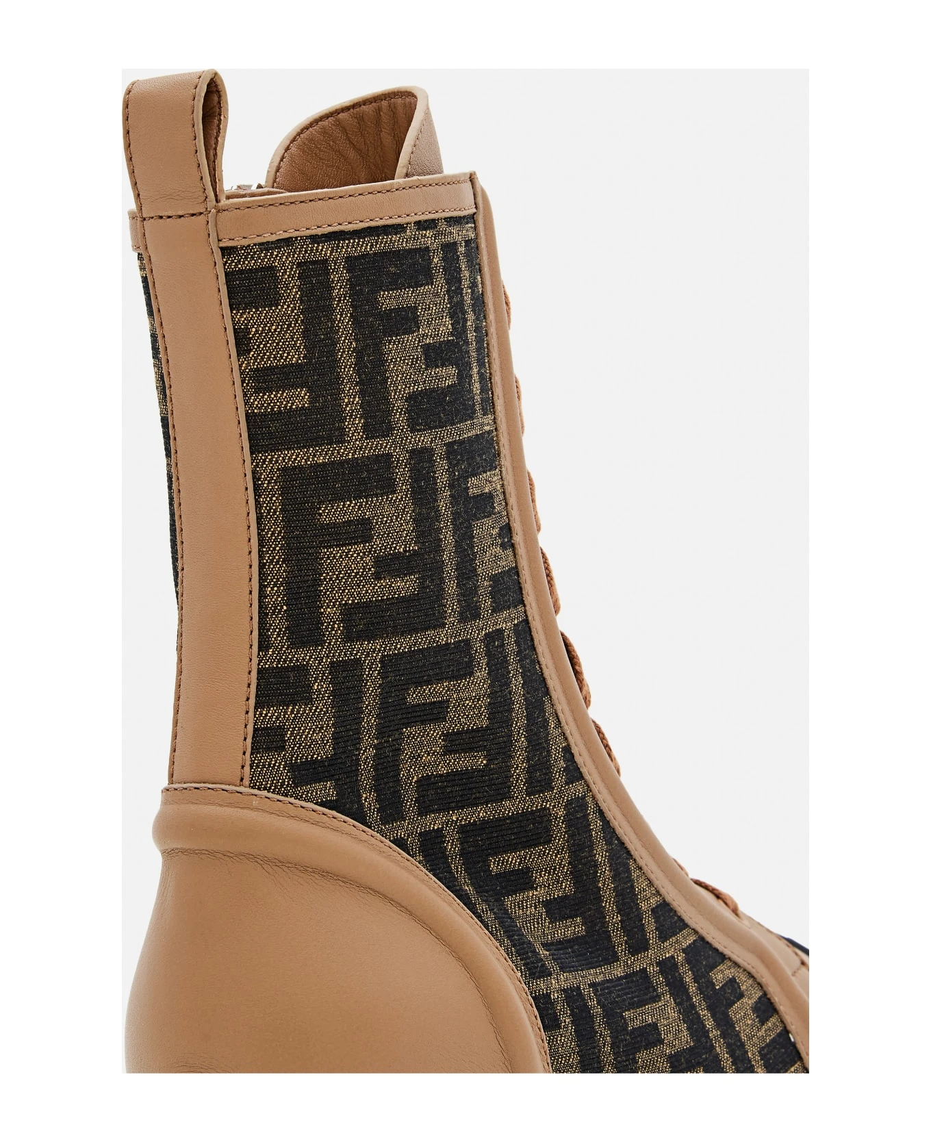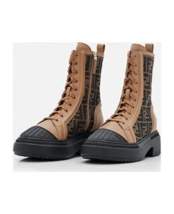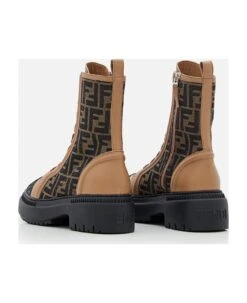 Fendi Domino combat boots with laces and side zip on the inside. Fabric insert with brown and tobacco FF jacquard motif. Rubber cupsole with embossed FF motif on the toe. Color: Brown.