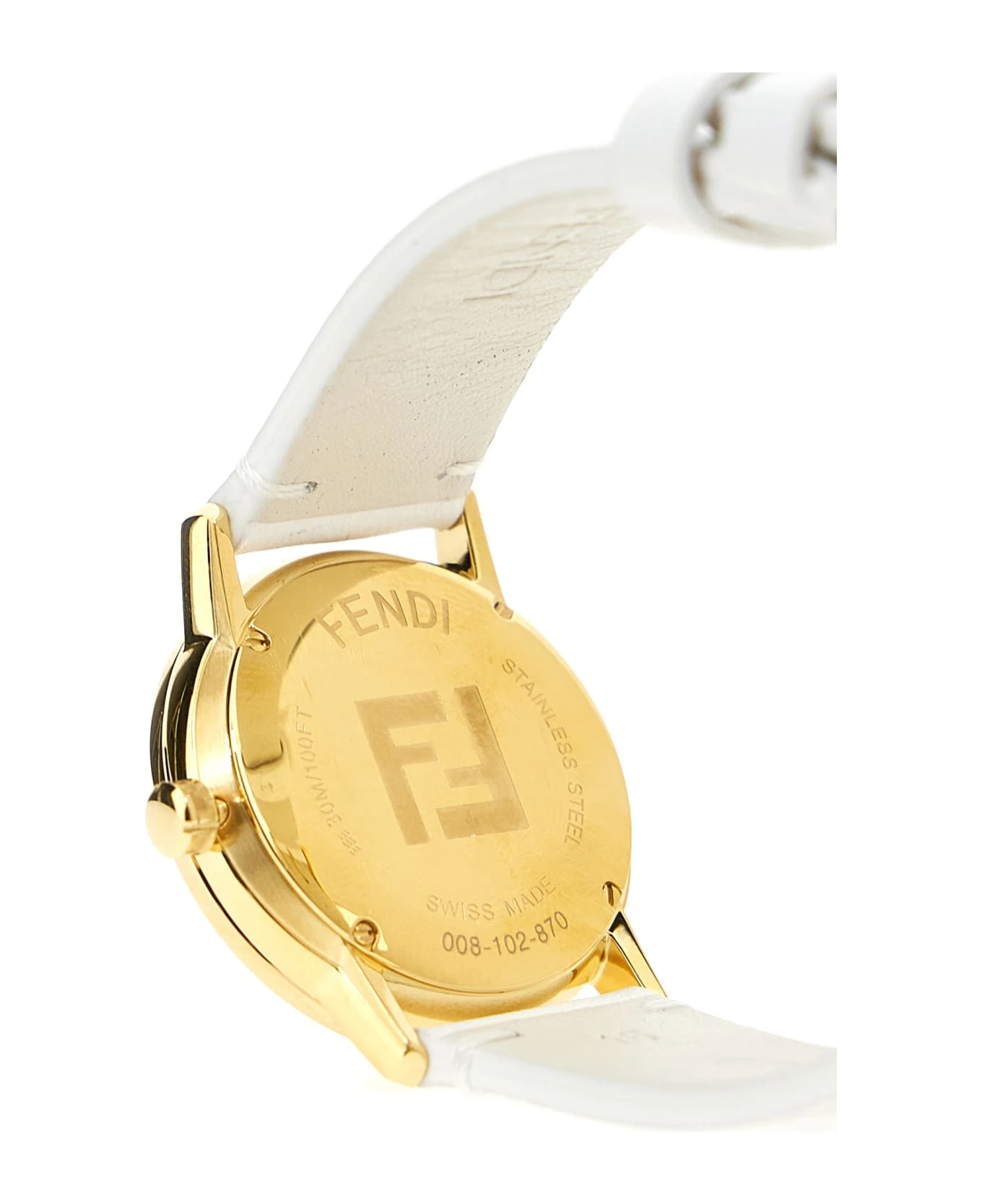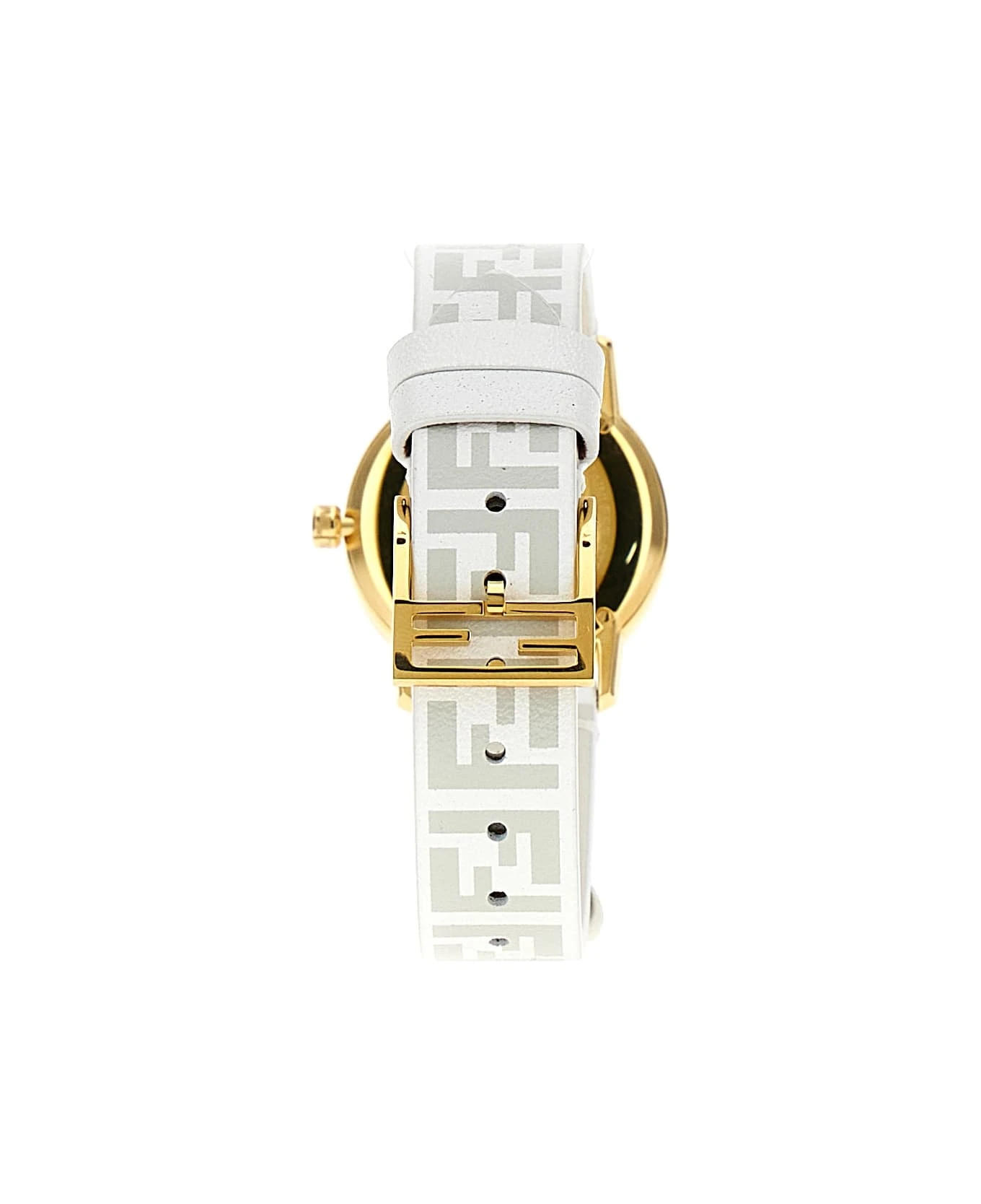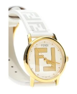 Fendi Forever More 29 Watch With 29 Mm Round Case, Gold Stainless Steel Bezel, Embedded White Onyx Stone Crown, Double Layer Sun Rayon With Gold Carved Ff Pattern, Embossed Indices And Gold Hand Hands With Radius Cut And Leather Strap With Gray Ff Pattern On A White Dial.