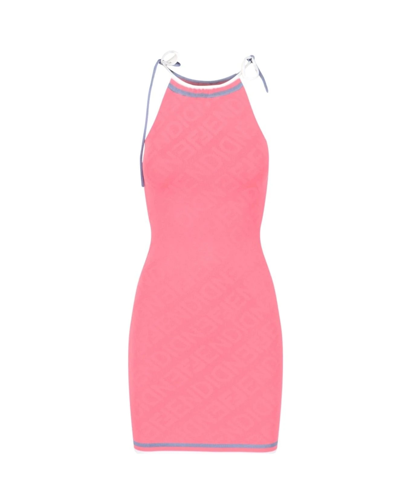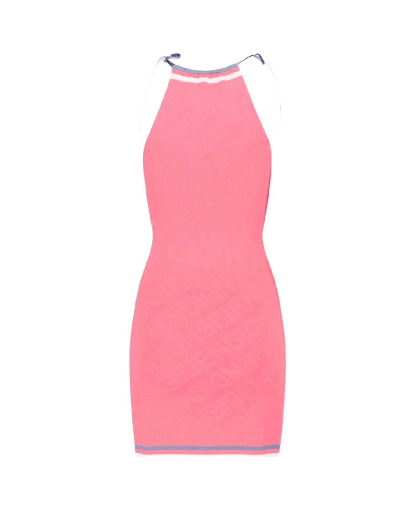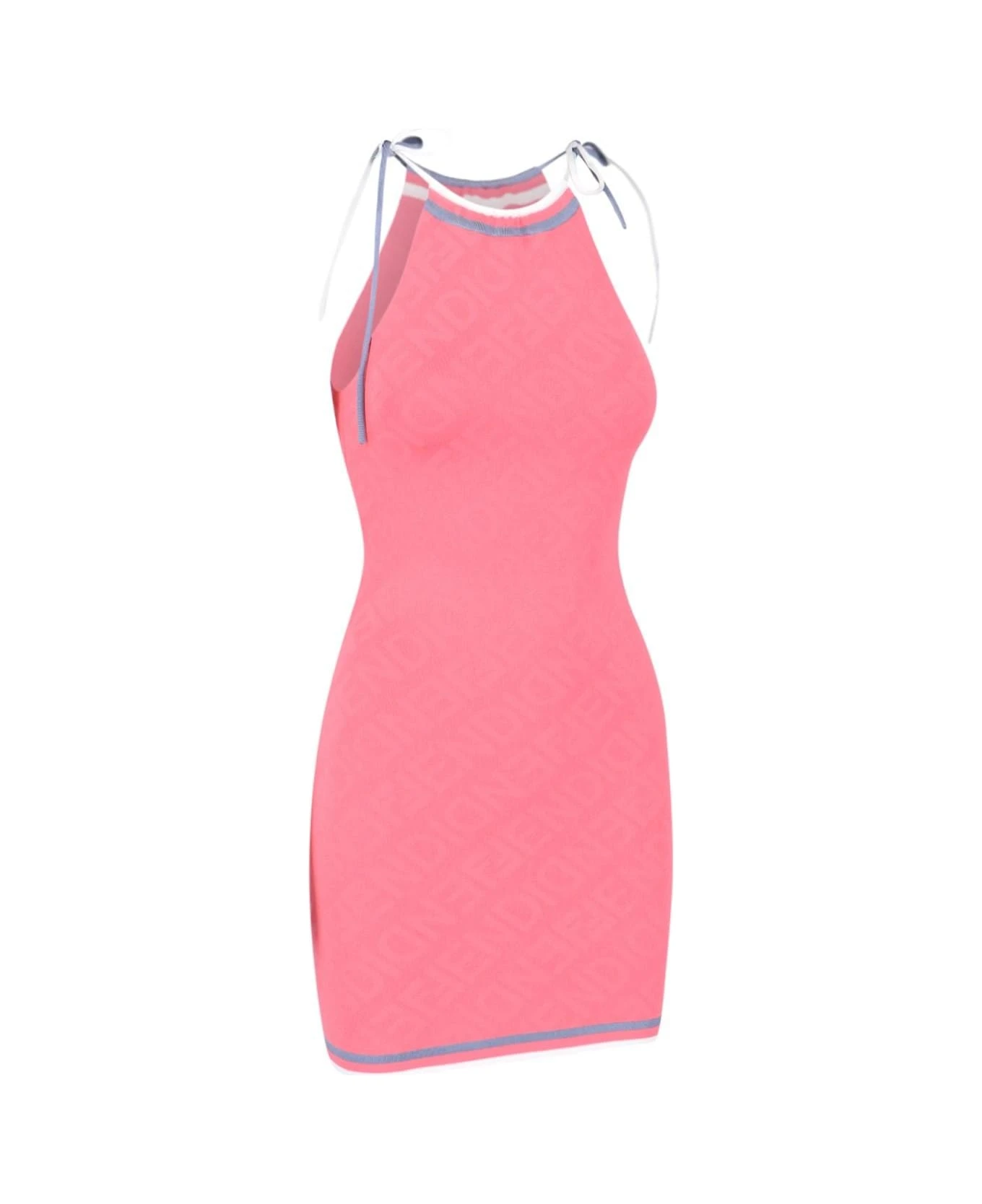 Fendi Logo Minidress In Pink Fabric With All-ove Logo Pattern, Straight Neckline, Sleeveless, White And Ring Details, Thin And Knotable Split Closure, Straight Hem.