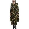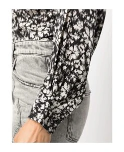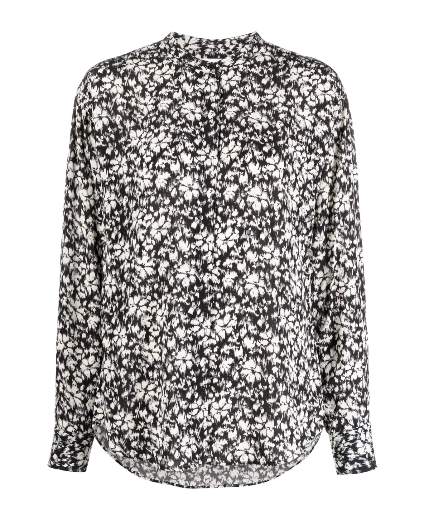 Floral-print round-neck shirt, round neck, front button fastening, long sleeves, buttoned cuffs, curved hem
