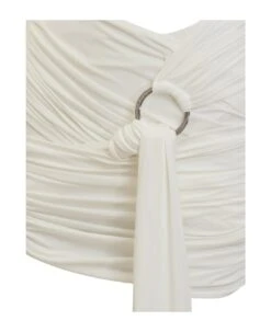 White miniskirt. Zip and hook closure. Elasticated waist. All-over curly effect. Long sash on the front. Logoed ring on the front.