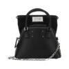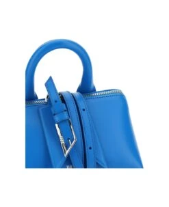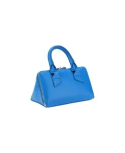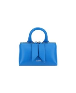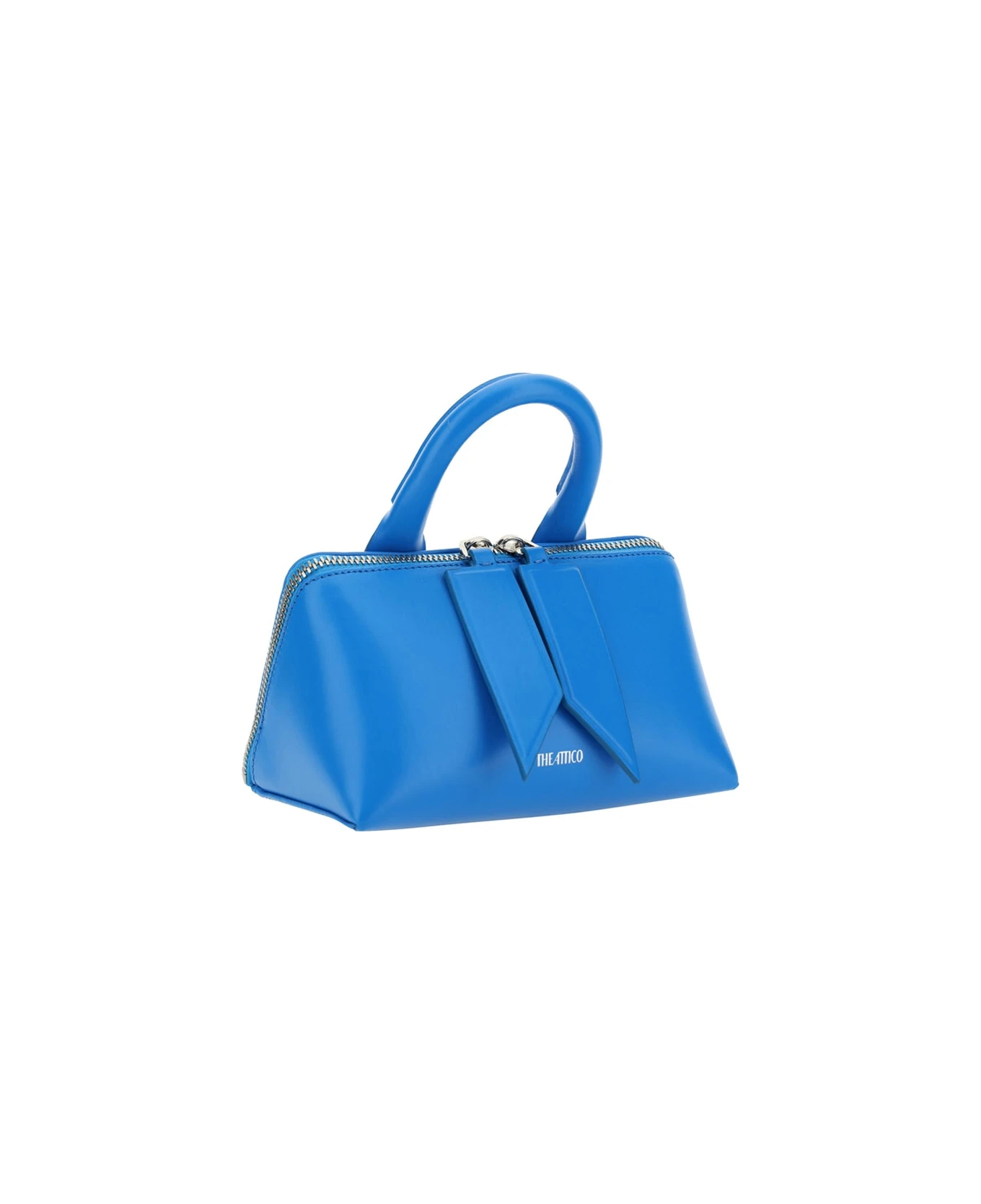Calfskin friday mini handbag by the attico, removable and adjustable flat leather shoulder strap, geometric shape, asymmetrical top zipper closure, double geometric pull, iconic brand monogram in contrasting pressure on front, single top stiff handle, interior flat pocket, protective metal feet on base of bag.