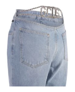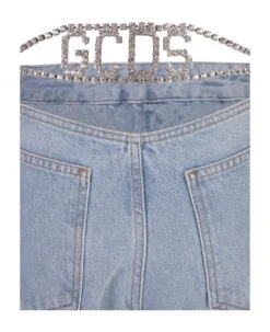 GCDS mid-rise jeans in stonewashed bleached denim, contrasting tobacco-coloured topstitching and GCDS logo choker detail at waist with rhinestones. Straight fit.