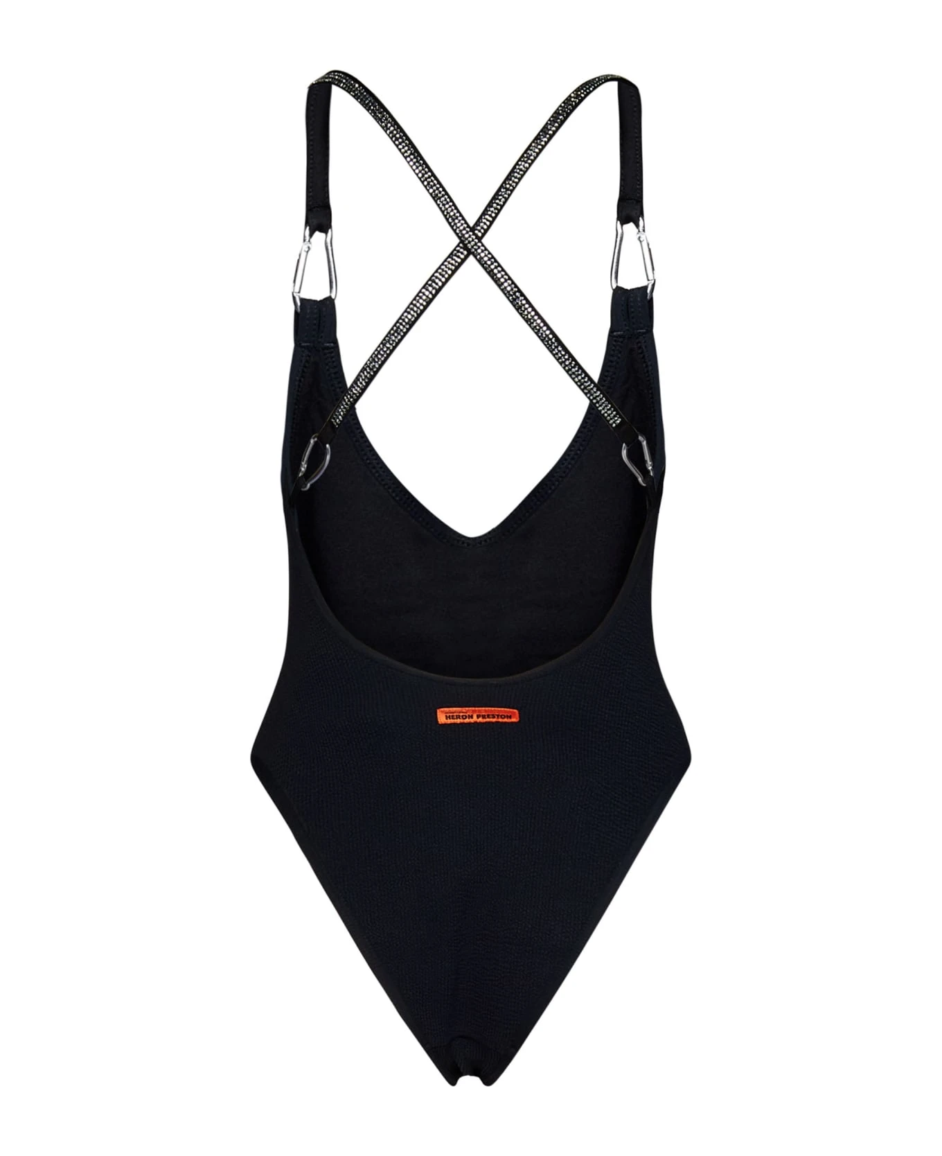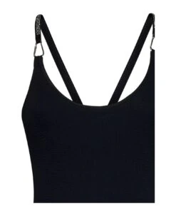 - Round neckline; Rhinestones-embellished straps crossed at back with silver metal carabiner hooks