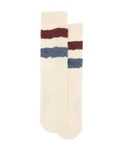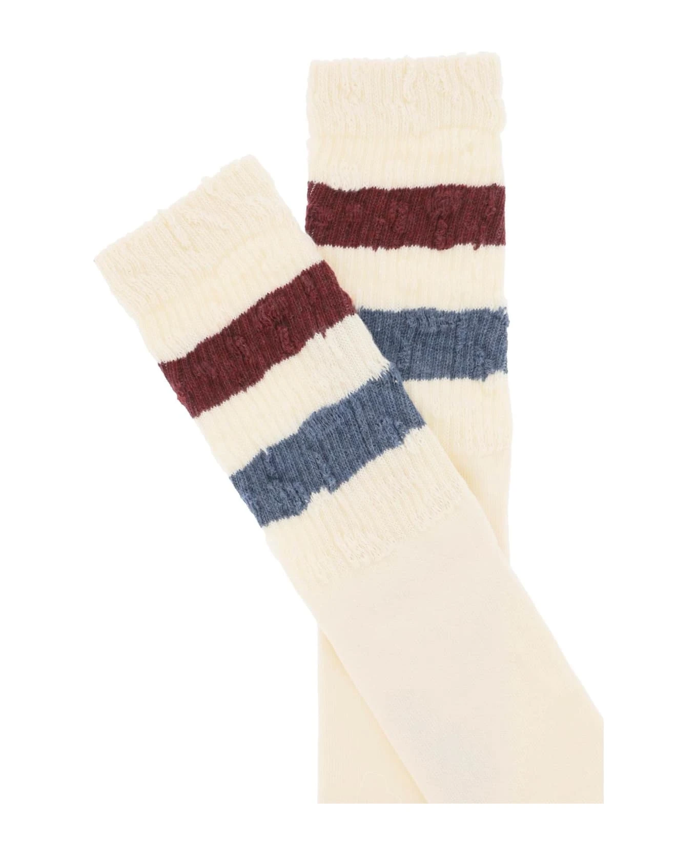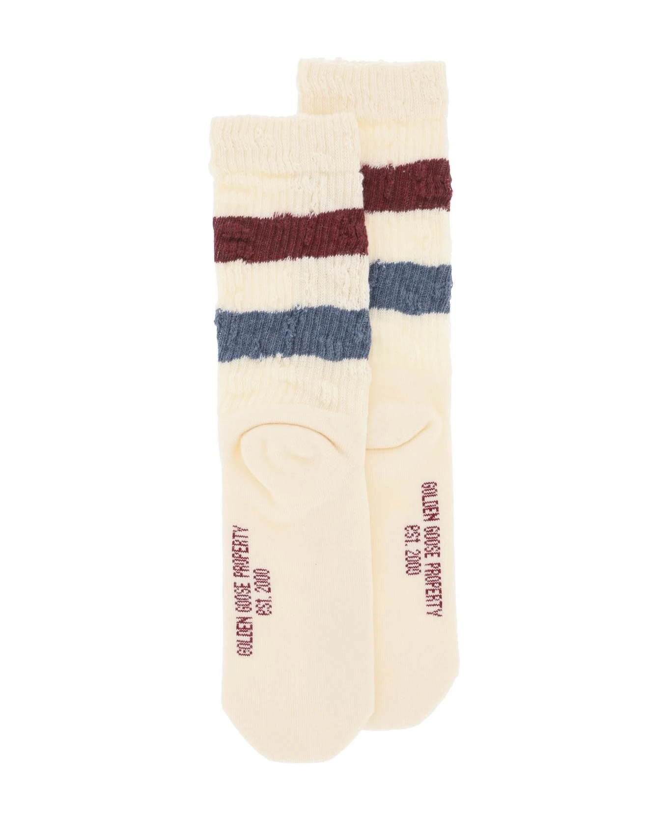 Golden Goose socks crafted in destroyed-effect stretch cotton blend with striped shaft and Golden Goose Property motif on the footbed. Ribbed edges. Item in photo is size S.