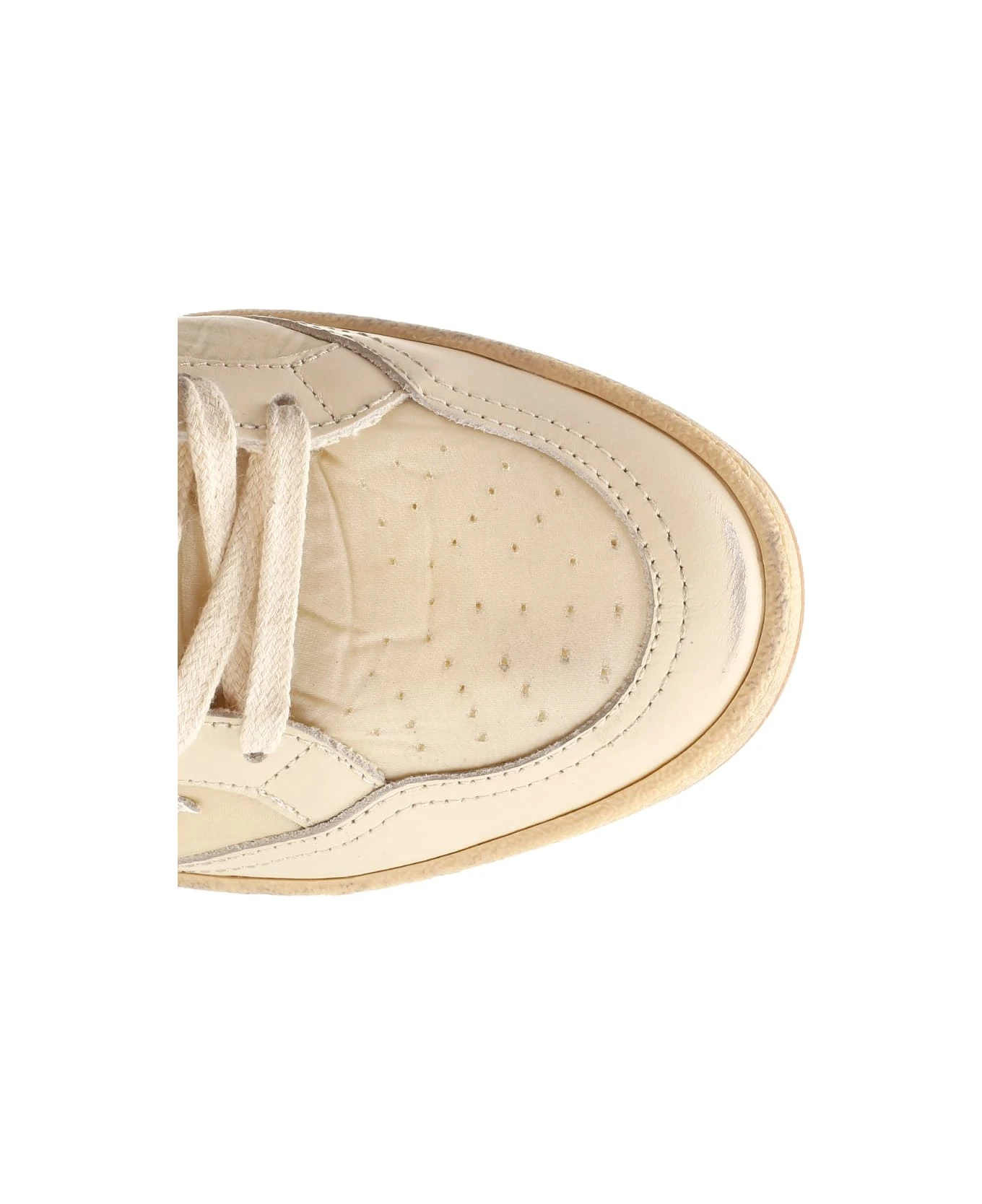 Ivory “Ballstar” sneakers with vintage treatment from Golden Goose in leather and nylon, terrycloth lining, white leather star, back patch, laces and stitching in tone.