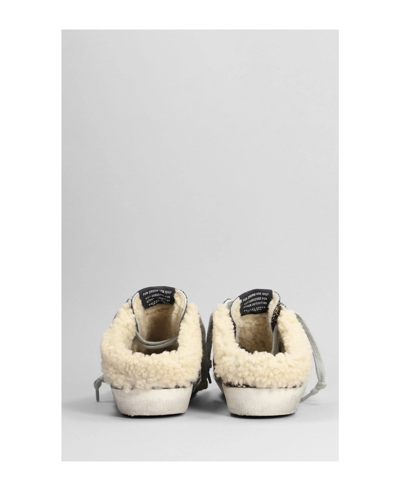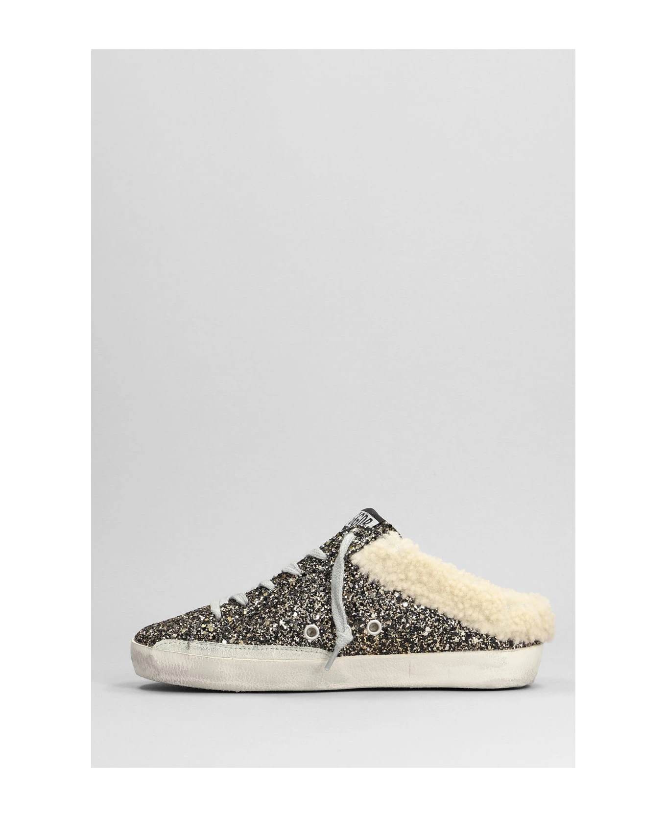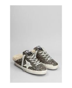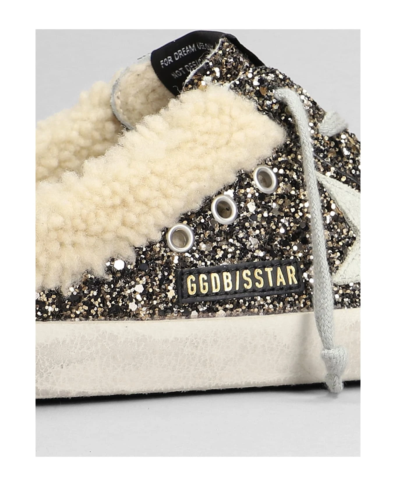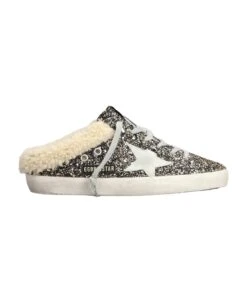 Superstar Sneakers in black glitter, open back, laces, glitter detail, faux fur, rubber outsole, Made in Italy